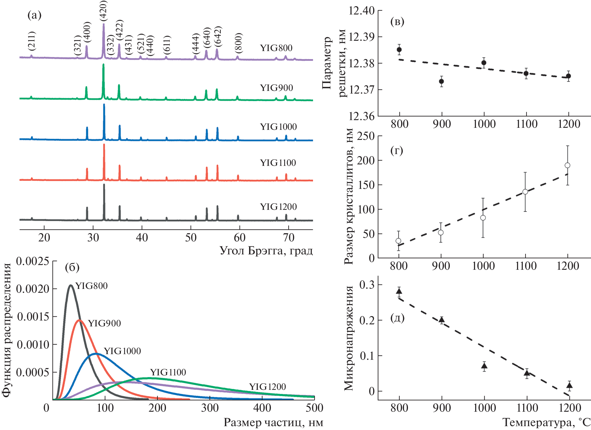 Iron-containing oxides form one of the most important classes of functional materials, which find a wide variety of applications. A promising approach is their use in biomedical technologies as components of systems for visualization, drug delivery, magnetic hyperthermia, etc. Nanocrystalline particles of Y3Fe5O12 garnet, obtained by glycine-nitrate combustion with subsequent thermal treatment, have been experimentally investigated. The results of studying the evolution of the crystal and magnetic structure of Y3Fe5O12 nanoparticles in dependence of the synthesis temperature are presented. A complex analysis using X-ray diffractometry, scanning electron microscopy, and Mössbauer spectroscopy has been performed. A relationship of the size and structural quality of Y3Fe5O12 nanoparticles with the observed magnetic characteristics is evealed.