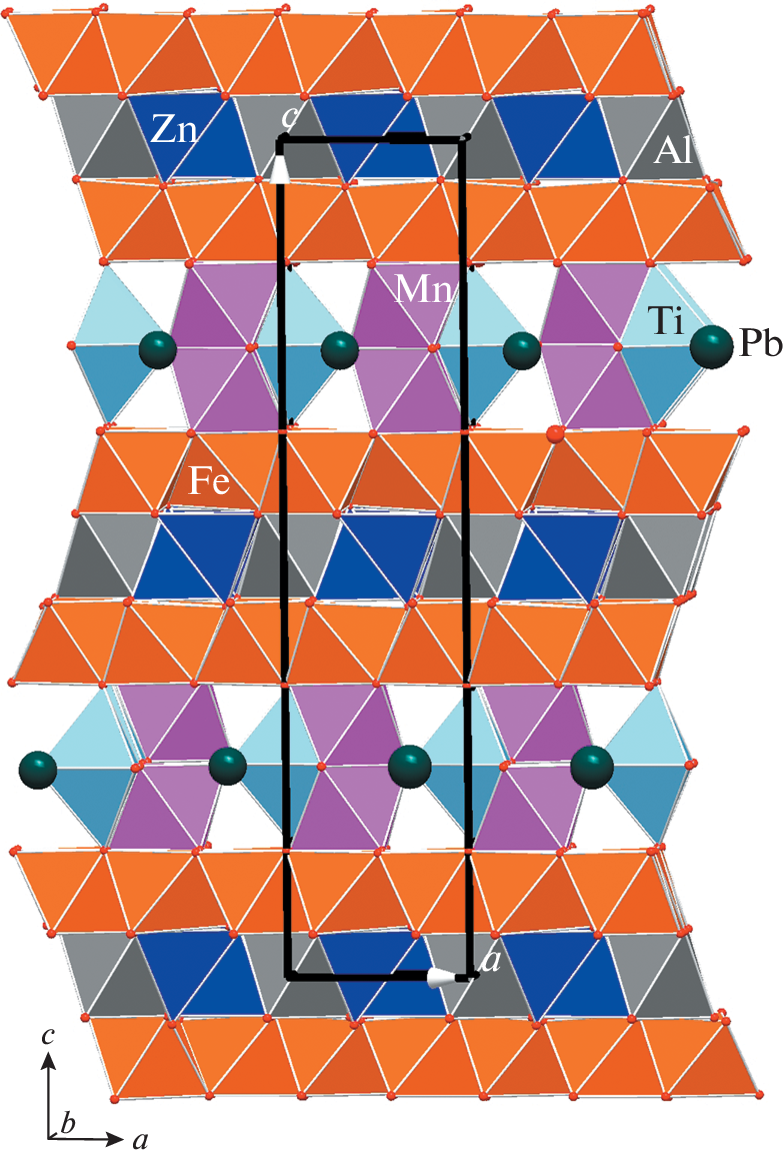 A variety of the mineral nezilovite, containing antimony and an elevated amount of titanium, has been studied using microprobe and X-ray diffraction analysis. The diffraction experiment was performed on a crystal presenting an aggregate of nezilovite and högbomite with close unit-cell parameters. The parameters of the hexagonal cell of the nezilovite studied are a = 5.8855(2) Å, c = 23.092(1) Å, V = 692.73 (4) Å3,sp. gr. P63/mmc. The structural model is refined using a limited number of unique reflections 231F > 4σ(F) to R = 0.08. The crystallochemical formula is (Z = 2) PbZn2(Ti0.9Al0.1)(Al0.6Sb )Mn Fe O18.5(O,OH)0.5. The distribution of cations of this composition over structure sites is established. A basis of the mineral structure is a set of spinel layers, consisting of edge-sharing Fe3+ octahedra. They alternate with two heteropolyhedral layers: Zn tetrahedra combine (Al,Sb) octahedra in one layer, and five-vertex Ti polyhedra combine dimers of Mn3+ octahedra in the other layer.