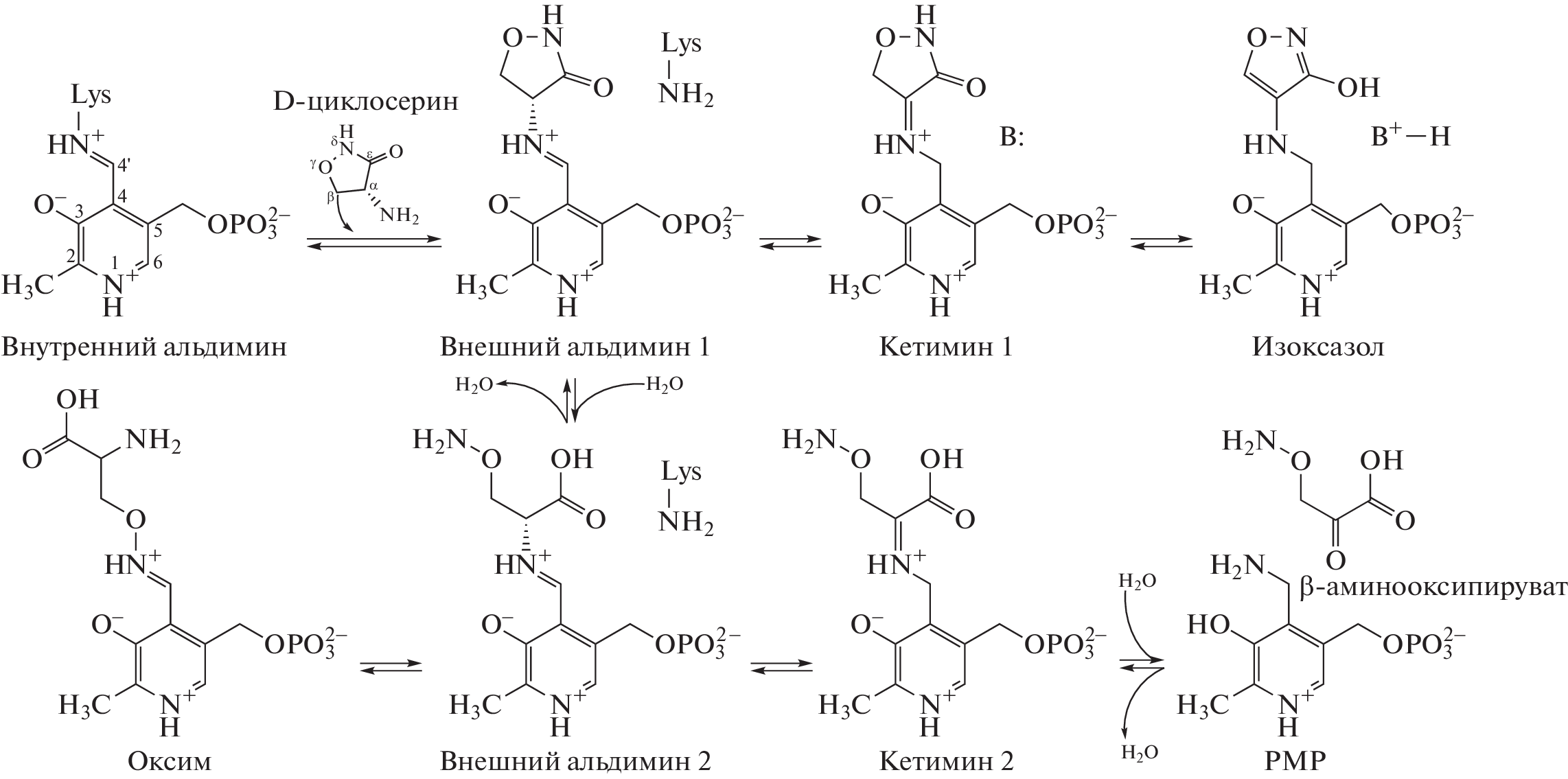 D-cycloserine inhibits pyridoxal 5'-phosphate (PLP)-dependent enzymes both reversibly and irreversibly. As an alanine racemase inhibitor, D-cycloserine is used in drug therapy in the treatment of tuberculosis. Several products of the interaction of D-cycloserine and PLP in the active site of the enzyme are known. The crystal structure of the complex of PLP-dependent D-amino acid transaminase from the bacteria Aminobacterium colombiense (Amico) with D-cycloserine obtained at a resolution of 1.9 Å is presented, in which the ring-opened adduct of PLP and D-cycloserine was discovered. In addition, the interaction of D-cycloserine with Amico has been characterized by the kinetic and spectral methods, various products of the interaction of D-cycloserine and PLP in the active site of transaminase have been determined, and the coordination of D-cycloserine and PLP adducts in the Amico active site has been analyzed. It is established that the products of the interaction of D-cycloserine with PLP in the Amico active site are several compounds, including PLP and DCS adducts in the cyclic and open forms, oxime formed by PMP and β-aminooxy-D-alanine, and PMP and β-aminooxypyruvate.