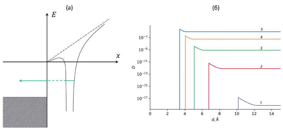 Рис. 3. Энергетическая схема, описывающая процесс ионизации атома в сильном электрическом поле вблизи поверхности металла (а). Расчетные зависимости прозрачности потенциального барьера D от расстояния d (б) при напряженности электрического поля: 200 (1), 300 (2), 400 (3), 500 (4), 600 МВ/см (5).