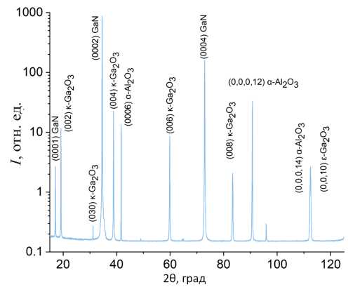 На рис. 2 представлен рентгенодифракционный спектр одной из полученных пленок с расшифровкой кристаллографических индексов. Он идентифицирует структуру пленки как орторомбическую κ-фазу оксида галлия. Ее пики узкие, их ширина сравнима или даже меньше, чем у буферного слоя нитрида галлия и монокристаллической сапфировой подложки. Этот факт свидетельствует о совпадении атомных плоскостей всех микропризм оксида галлия, параллельных плоскости подложки (0001).