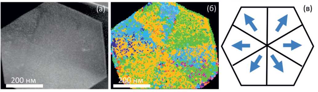 Рис. 3. ПЭМ-изображение (а) и ориентационная карта дифракции обратно рассеянных электронов, снятая с шагом пикселей 10 нм (б) одной из одиночных микропризм оксида галлия; схема расположения вращательных доменов в идеальной гексагональной призме (в). Стрелки показывают направление [010] орторомбической структуры.