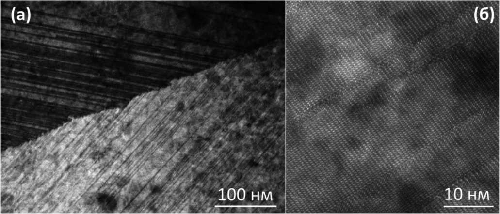 Рис. 5. ПЭМ-изображение участка образца микропризмы оксида галлия вблизи границы двух сопряженных доменов (а). ВРПЭМ-изображение участка домена с множественными антифазными границами внутри (б).