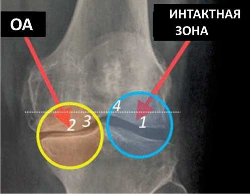 Рис. 1. Рентгенограмма поврежденного ОА коленного сустава: 1 – интактная область, 2 – область склерозированной кости, 3 – промежуточная область, 4 – дистальная сторона спила (пунктир).