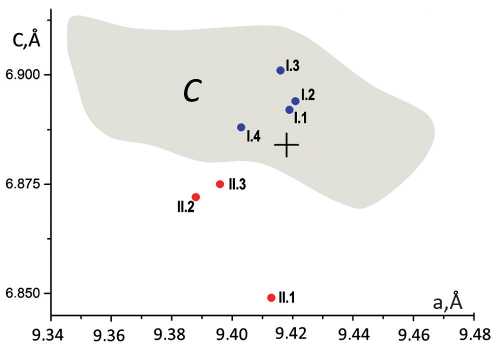 Точками на рис. 2 отмечены значения постоянных а и с элементарной ячейки CaOHап, полученные для образцов групп I и II. Для сравнения на рисунке отмечена область С (затемненная зона), внутри которой заключено множество значений а и с гексагональных кристаллов CaOHап, синтезированных различными методами в работе [8]. Крест указывает положение аst = 9.418 и сst = 6.884 Å [26] в стехиометрическом кристалле CaOHап.