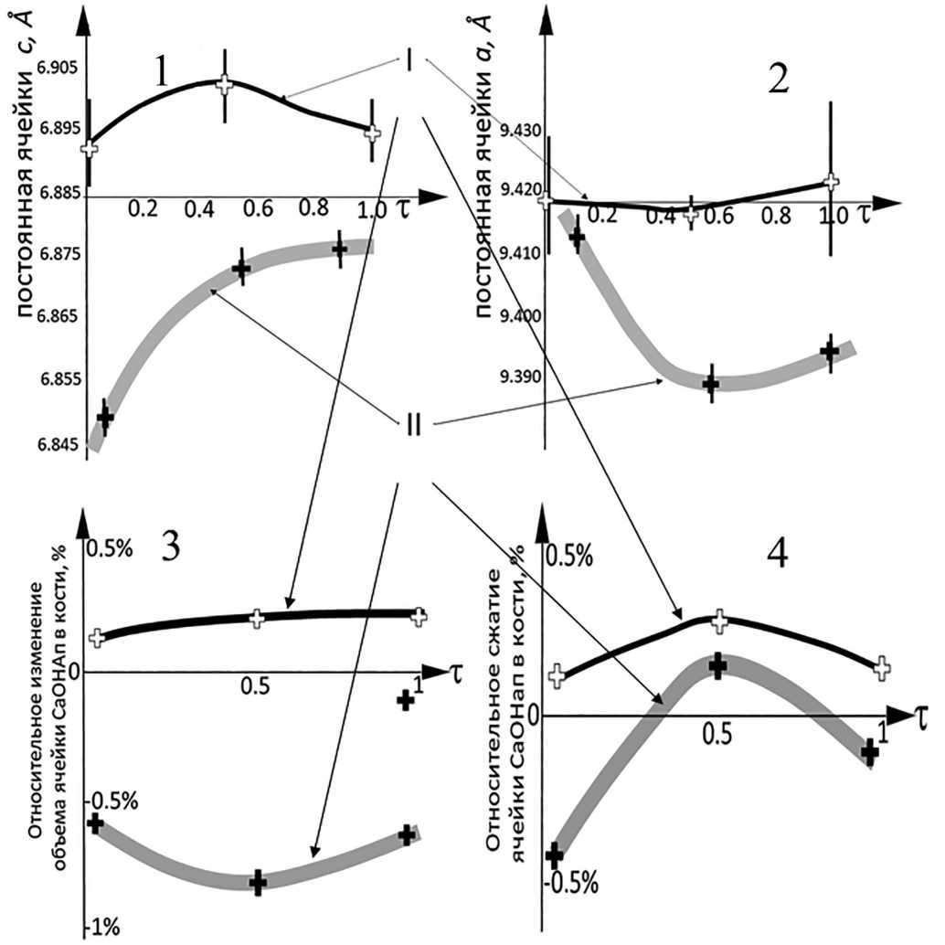 Зависимости а, с, v и δ как функции τ показаны на рис. 3. Видно, что характеристики кристаллической ячейки и тенденции их изменений существенно различаются. В I объем ячейки увеличен, она растянута вдоль оси с и демонстрирует слабые изменения постоянной a. Напротив, в II объем ячейки сжат, а сама ячейка сплющена вдоль оси с. Отчетливая одноосная деформация кристаллической ячейки в зависимости от возраста указывает на перспективность исследования дихроизма фотопоглощения для визуализации возрастных изменений в костных наноструктурах.