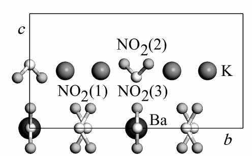 Характер сегнетоэластического ФП при 420 K ставит вопрос о правильности интерпретации данных РСА для параэластической фазы [11]. Поскольку в результате ФП типа порядок–беспорядок происходит только ориентационное упорядочение в группе NO2(2), то взаимные расположения атомов этой группы в пара- и сегнетоэластической фазе не должны сильно различаться. Однако из приведенных в этой работе структурных данных для парафазы следует, что позиции атомов N(2) и O(2) находятся в одной плоскости с атомами K (z/c = 0.5). Отметим, что нитритные группы являются довольно жесткими, и искажения угла между азот-кислородными связями в структуре [11] являются энергетически невыгодными. Данное противоречие можно разрешить в рамках альтернативной интерпретации результатов [11], согласно которой найденные позиции атомов N(2) и O(2) являются результатом статистического усреднения по двум ориентациям групп NO2(2) с противоположным направлением дипольного момента (параллельного оси z). Для проверки этого предположения была выполнена оптимизация положений атомов в 60-атомной сверхъячейке, в которой начальные положения атомов N(2) и O(2) находились в одной плоскости. Однако, как показали расчеты, данные позиции оказались неустойчивыми, в результате минимизации энергии атомы смещались в положения, показанные на рис. 5. Таким образом, данные Петрашко отвечают не реальным позициям атомов N(2) и O(2) в элементарной ячейке, а их усредненным значениям.
