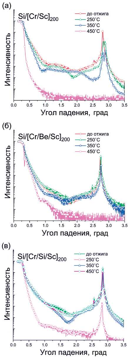 Влияние барьерного слоя бериллия на структуру зеркала можно проследить на рис. 2б. Как следует из анализа кривых отражения зеркала Si/[Cr/Be/Sc]200, введение Be приводит к увеличению интенсивности брэгговского пика при нагреве до 250°C, что свидетельствует о положительном влиянии отжига на отражательную способность МРЗ, однако при температуре 350°C наблюдается падение интенсивности. Одновременно с увеличением интенсивности при температуре 250°C исходный брэгговский пик смещается в сторону больших углов, что свидетельствует об уменьшении периода. Этот сдвиг сохраняется при дальнейшем повышении температуры. При отжиге до 450°C интенсивность брэгговского пика образца Si/[Cr/Be/Sc]200 уменьшается до нуля, что указывает на перемешивание системы, и можно сделать вывод, что Be не препятствует перемешиванию слоев.