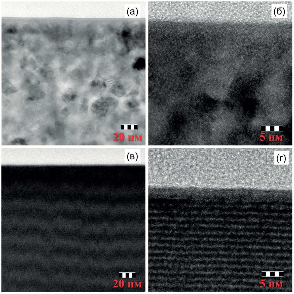 Рис. 4. ПЭМ-изображения, полученные с разным увеличением, образцов Si/[Cr/Be/Sc]200 (a, б) и Si/[Cr/Si/Sc]200 (в, г), отожженных при 450°C.