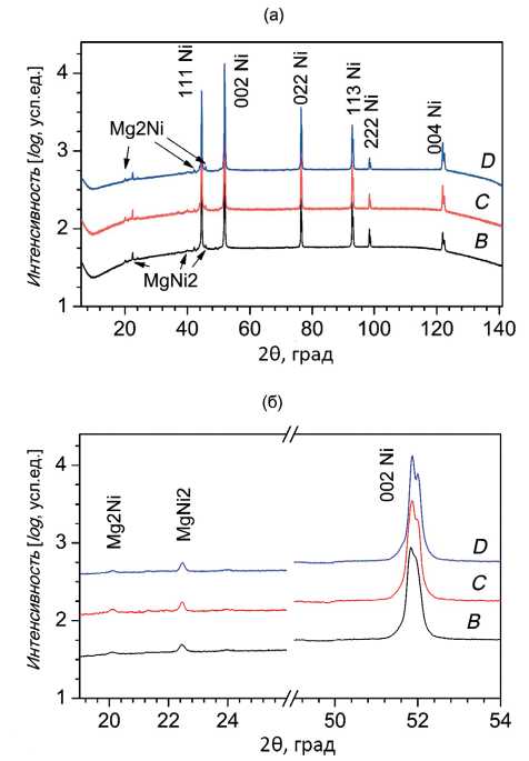 На рис. 2б представлены фрагменты картин РД исследованных образцов. Видно, что для разных образцов рефлексы hkil = 0004 с углом Брэгга 2θ = 22.49° от подслоя интерметаллида MgNi2 по крайней мере сравнимы по величине друг с другом так же, как сравнимы друг с другом самые сильные рефлексы никеля (с индексами Миллера hkl = 002 и углом Брэгга 2θ = 51.83°).