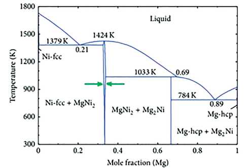 На рис. 3 приведен типичный вид фазовой диаграммы системы Ni–Mg. Видно, что некоторый диапазон концентраций в районе идеального состава 33.3% Mg (т.е 66.7% Ni) имеет место, однако его величина обычно не указывается. На рис. 3 этот диапазон обозначен стрелками.