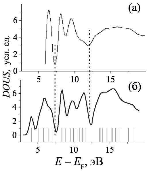 Рис. 4. DOUS пленок DBBA на основе результатов СПТ-экспериментов (a) и на основе результатов расчетов с использованием методов DFT (б). Расчеты проводили методом DFT на уровне B3LYP/6–31G(d) и использовали последующую корректировку по формулам SVOE. Линейчатый спектр в нижней части (б) – значения энергий молекулярных орбиталей, установленных в ходе расчета теоретической DOUS. Вертикальные пунктирные линии проведены для удобства сравнения положения максимумов.