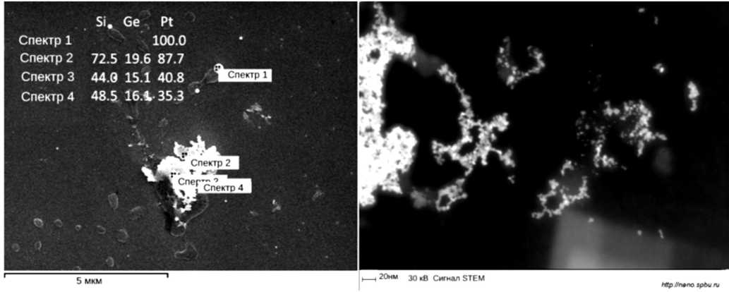 Рис. 2. Структура (санирующий электронный микроскоп) и элементный состав частиц (энергодисперсионный анализ, подложка Ge) для платинового электрода. Напряжение в импульсе 8 кВ, время экспозиции 10 мин.