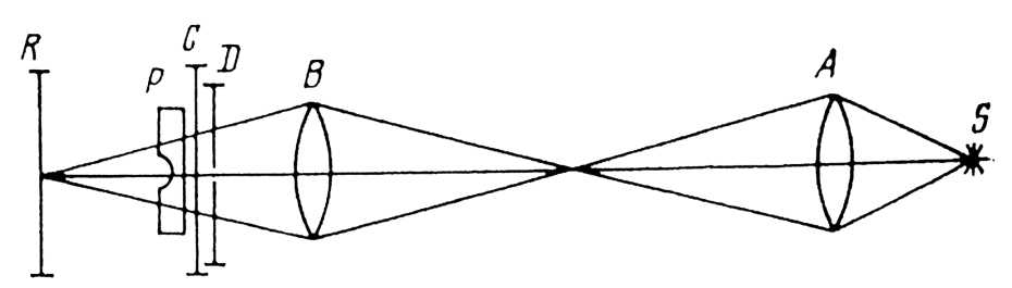 Рис. 1. Схема прибора для наблюдения фигур астеризма: S – источник света, A и B – собирательные линзы, D – диафрагма, C – стеклянная подставка, на которую помещается препарат P полированной поверхностью вниз, R – рамка с матовым стеклом.