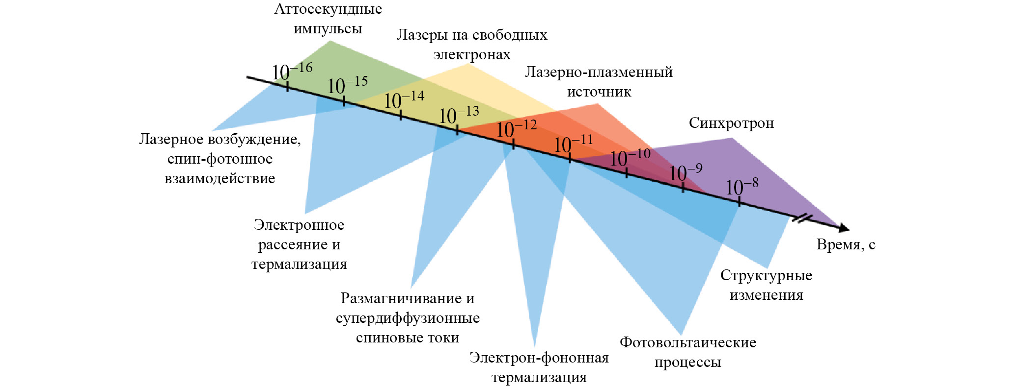 Воздействие лазерного излучения способно активировать множество различных физических процессов, каждый из которых обладает характерными временами (рис. 1). Сегодня для реализации времяразрешающих рентгеновских экспериментов в широком диапазоне времен в основном используются следующие источники рентгеновского излучения: аттосекундные рентгеновские импульсы (генерация гармоник высокого порядка) [13], лазеры на свободных электронах, лазерно-плазменные источники, а также синхротроны.