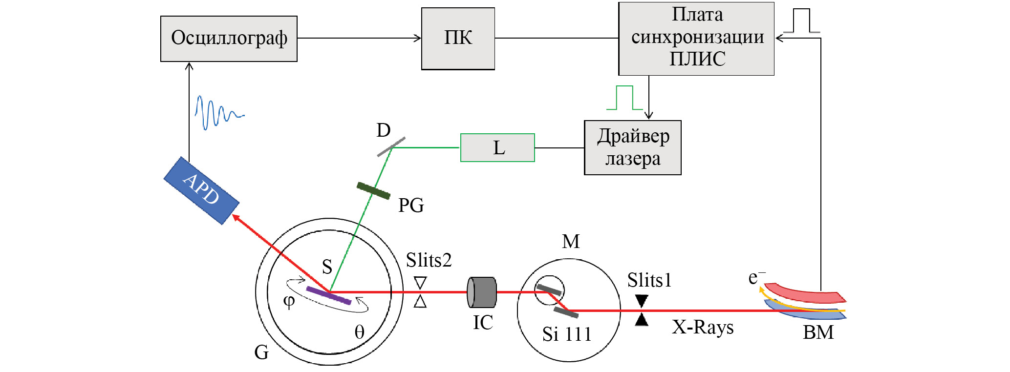 Рис. 2. Схема экспериментальной установки: BM – источник СИ (поворотный магнит), Slits1 – щели белого пучка, Slits2 – щели монохроматизированного пучка, M – двухкристальный монохроматор Si 111, IC – ионизационная камера, G – гониометр с установленным образцом, S – образец, L – источник лазерного излучения, D – дефлектор, PG – призма Глана. Плата синхронизации запускает блок управления лазером с заданной задержкой в соответствии с опорным высокочастотным сигналом накопительного кольца. Осциллограф позволяет оцифровать аналоговый сигнал, поступающий с детектора