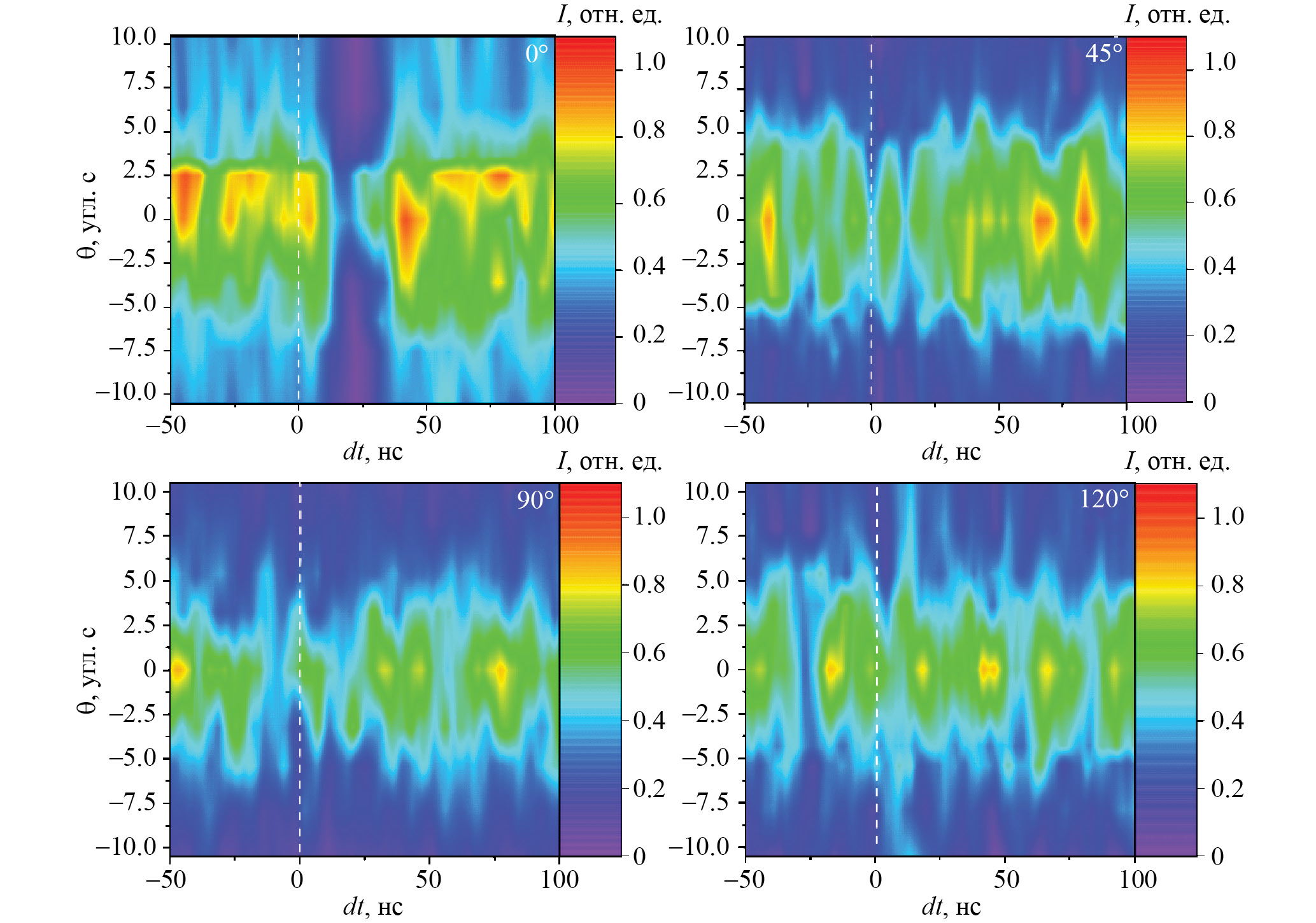 Рентгенодифракционные измерения. В рамках эксперимента зарегистрирована динамика КДО кристалла LiNbO3:Fe при воздействии лазерного излучения при различных азимутальных углах j, совпадающих с направлением поляризации лазерного излучения относительно кристаллографической оси X [20]. Полученные массивы данных типа I(q, t) представлены в виде трехмерных карт в координатах время–угол–интенсивность во временном диапазоне от –50 до +150 нс (0 нс соответствует моменту начала воздействия лазерного импульса) (рис. 3).