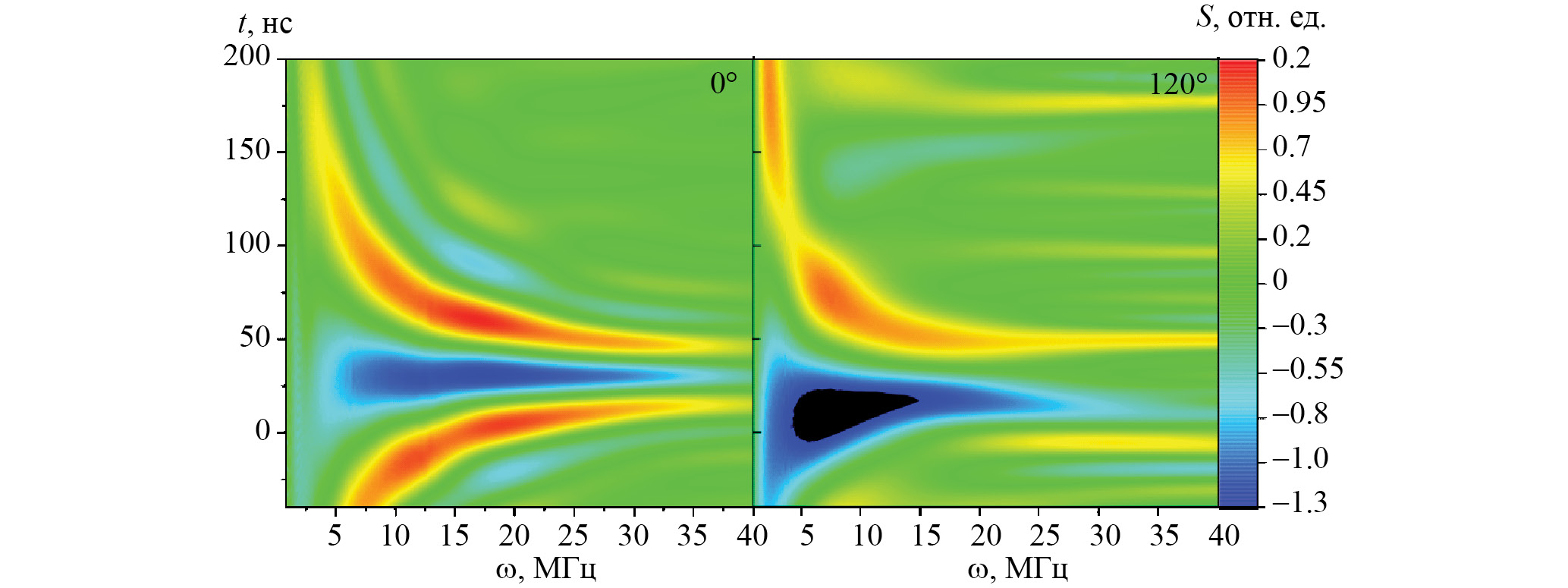 Обработка данных показала существенные различия в динамике наблюдаемых процессов. Результаты представлены на рис. 4 в ω–t-пространстве. При j = 0° сразу после воздействия наблюдается незначительный рост интегральной интенсивности КДО, причем диапазон частот очень широк – до 40 МГц, затем следует резкое уменьшение сигнала, спектр составляет ~35 МГц. Такой широкий спектр (почти горизонтальная линия в ω–t-пространстве) свидетельствует о крайне высокой скорости изменения сигнала, близкой к предельному временному разрешению метода. Спустя ~50 нс после лазерного воздействия сигнал возвращается к исходному виду со спектрально-временной формой, зеркальной относительно первоначального возбуждения.