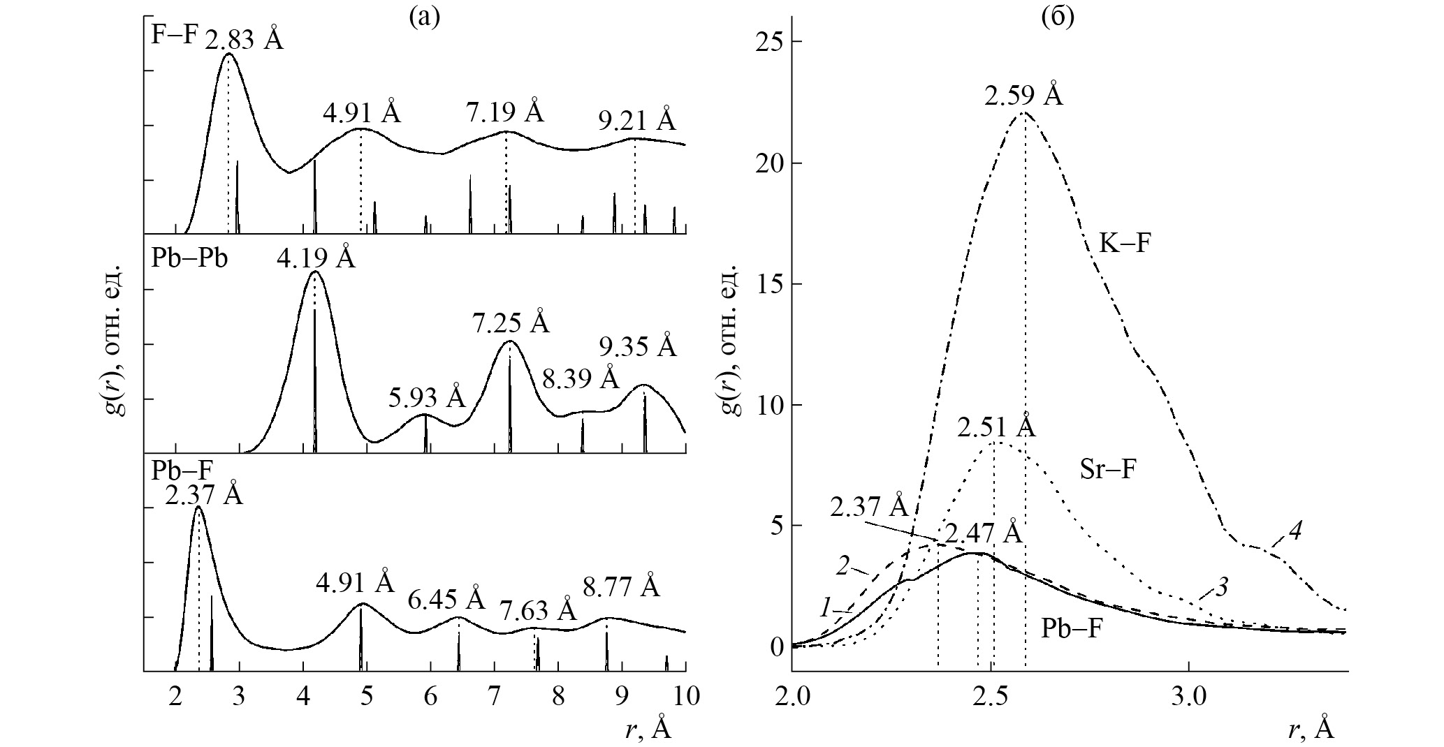 Рассчитанные РПКР распределения для системы Pb25Sr6KF63 представлены на рис. 2. Как видно из рис. 2а, максимумы на кривой для пары Pb–Pb отвечают максимумам для идеальной флюоритовой решетки, в то время как максимумы на кривых для пар F–F и Pb–F существенным образом смещены относительно максимумов для идеального кристалла.