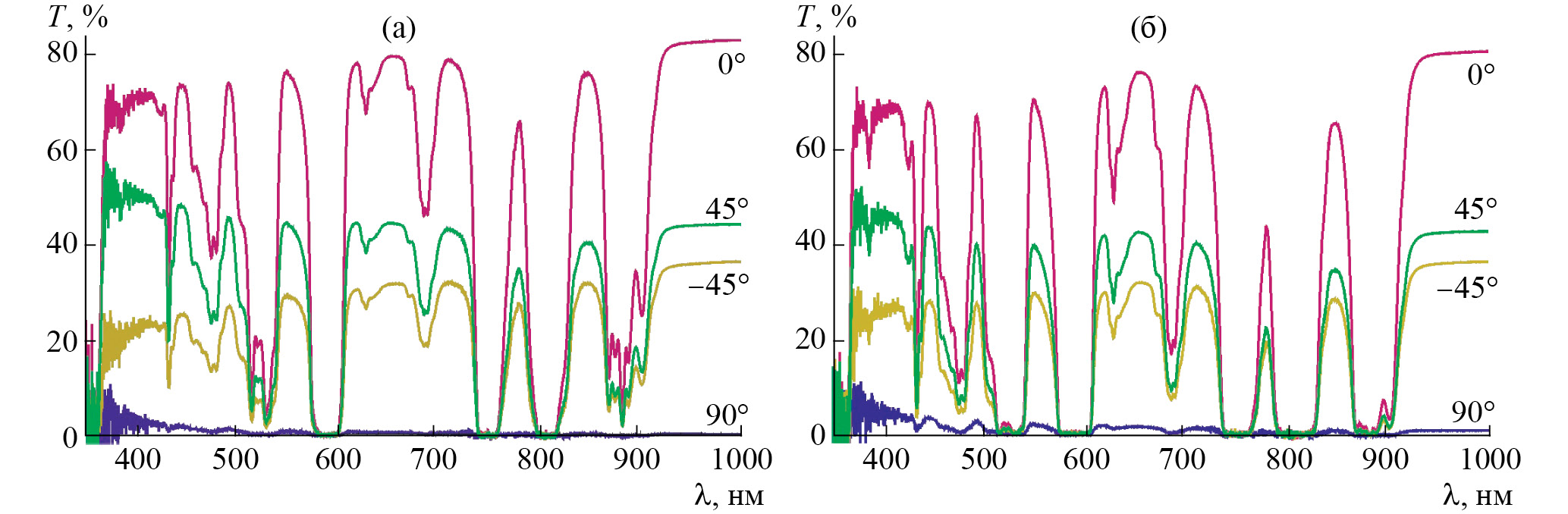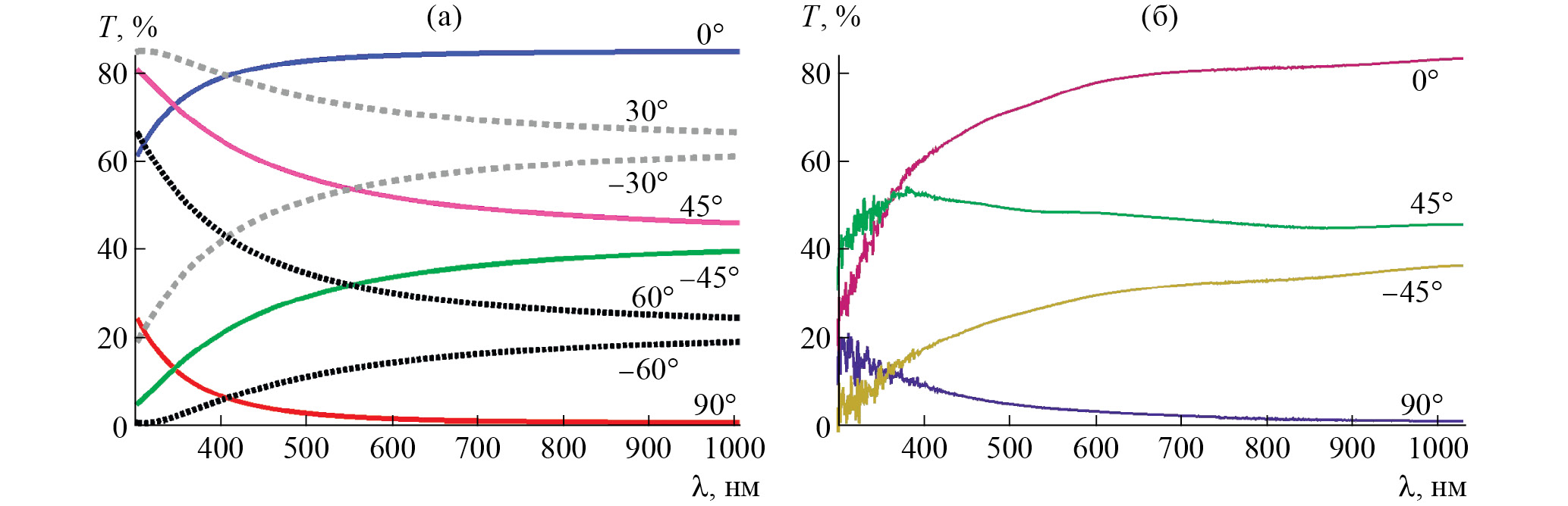 На рис. 2а приведены рассчитанные спектры пропускания в поляризованном свете при разных положениях поляризаторов на примере кристалла LGS толщиной 1.76 мм.