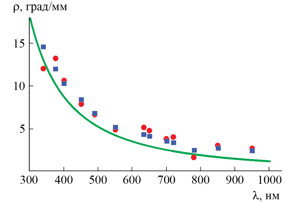 На примере измерения спектров пропускания кристаллов LGS (рис. 2б) и расчета величины ρ по формулам (4)–(6) показано, что для тонких образцов лучшие результаты получаются при использовании спектров пропускания при –45º и 45º, –30º и 30º. Такой вывод был сделан исходя из сравнения полученных значений ρ для LGS с известными экспериментальными данными [10]. При расчетах из спектров, измеренных при параллельных и скрещенных поляризаторах, получаются заметно завышенные результаты, поэтому использовать их для тонких образцов нецелесообразно. Наиболее близкие к экспериментальным величины ρ получаются при усреднении данных, рассчитанных из спектров пропускания при τ = ±30º и ±45º. Именно так проведен расчет ρ для кристаллов лангасита с разным содержанием Nd.
