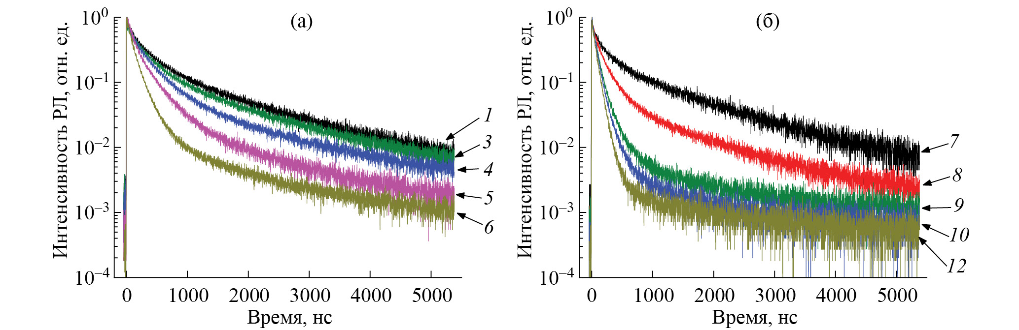 Компонента с τ = 68–80 нс, очевидно, принадлежит люминесценции ионов Се3+, компонента с τ = 190 (320) нс также, по-видимому, принадлежит ионам Се3+, ассоциированным с экситонами, локализованными на дефектах замещения и F+-центрах [13, 21]. Наиболее медленная компонента имеет время спада 1.35 и 1.09 мкс у образцов 1–5 и 6–13 соответственно и является либо излучением основы, либо послесвечением люминесценции церия, вызванным присутствующими в составе примесями [22, 23].