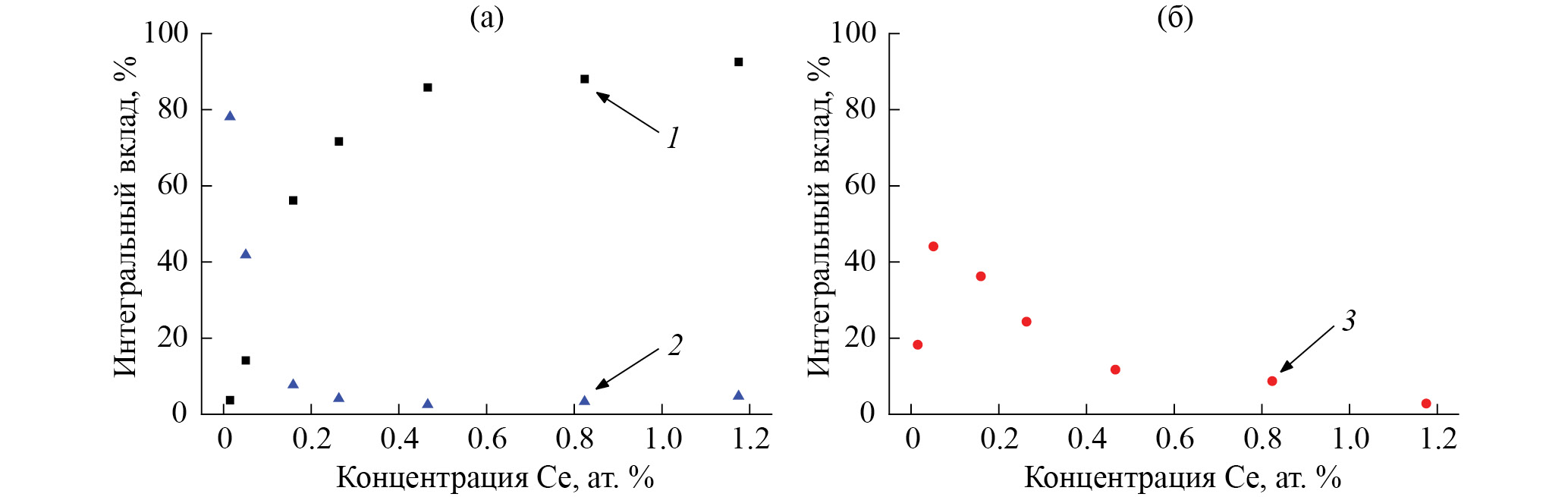На рис. 5 представлены зависимости интегральной интенсивности компонент РЛ от концентрации ионов Се3+ (образцы 7–13), построенные по данным табл. 2. С увеличением концентрации ионов Се3+ наблюдаются рост интегрального вклада быстрой компоненты с τ = 68 нс и уменьшение вклада РЛ основы. При концентрации Се3+ более 0.3 ат. % наблюдается практически полное тушение РЛ основы. Для промежуточной компоненты с τ = 190–320 нс (табл. 2, рис. 5б) наблюдается та же тенденция, за исключением области очень малых концентраций ионов Се3+ (менее 0.046 ат. %). Рост вклада промежуточной компоненты в области малых концентраций можно связать с резким ростом количества дефектов, участвующих в процессе возбуждения РЛ ионов Се3+. При концентрации Се3+ более 0.42 ат. %. вклад этой компоненты в кинетику РЛ не превышает 12%. Проведенные измерения показывают, что по быстродействию монокристаллы с относительно высокой концентрацией Се3+ не уступают прозрачной керамике, исследованной в [24].
