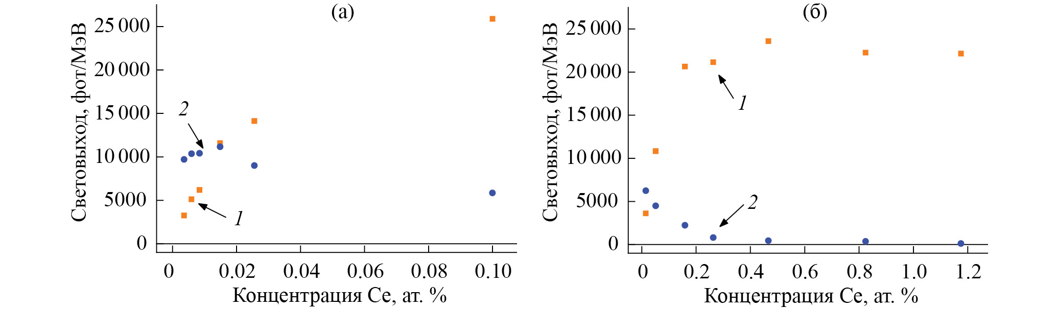 Рис. 6. Зависимость световыхода сцинтилляций кристаллов ИАГ:Се от концентрации активатора: 1 – световыход ионов Се3+, 2 – световыход основы; а – кристаллы, выращенные методом ГНК, б – кристаллы, полученные при спонтанной кристаллизации