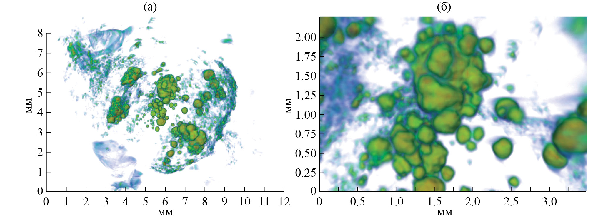 Проведено детальное исследование физиологических кальцификатов в шишковидной железе и хороидном сплетении головного мозга человека с использованием метода рентгеновской микротомографии. Полученные результаты показали, что размер отдельных конкрементов может достигать сотен микрометров, а агрегированных конгломератов – до нескольких миллиметров (рис. 2). Кальцификаты в хороидном сплетении имеют преимущественно правильную сферическую форму с концентрической слоистой структурой, развивающейся из единого первичного центра их образования [6].