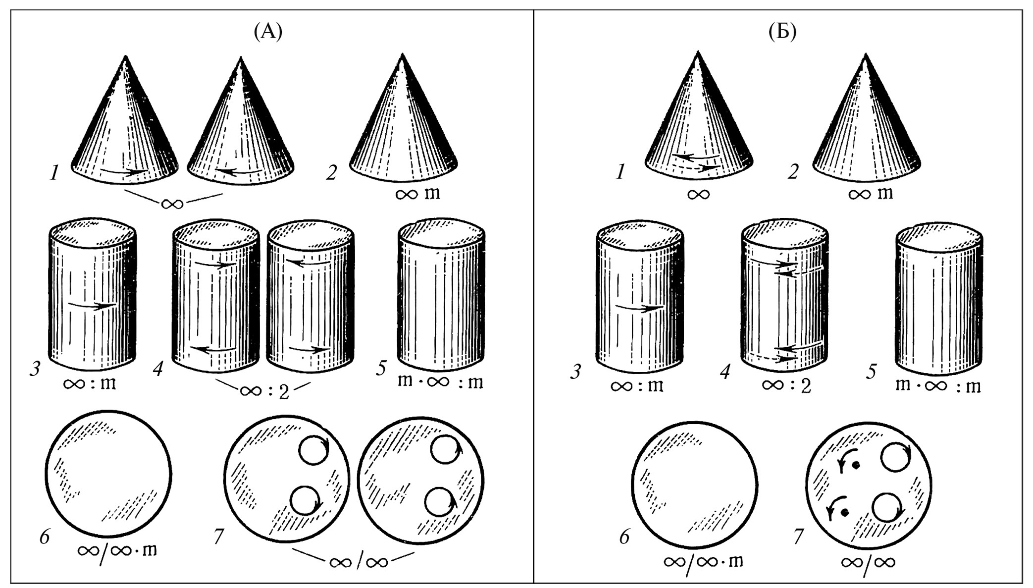 Рис. 1. Предельные точечные группы Кюри, оформленные А.В. Шубниковым [10, рис. 1] (А); модифицированная схема Шубникова: энантиоморфные формы объединены в одну фигуру, двойственность которой показана двойными, разнонаправленными стрелками (Б): 1 – вращающийся конус L∞; 2 – простой конус L∞ ∞ P; 3 – вращающийся цилиндр L∞ ПC; 4 – закрученный цилиндр L∞ ∞ L2; 5 – простой цилиндр L∞ ∞ L2 ∞ PПC; 6 – простой шар ∞ L∞ ∞ PC; 7 – шар с закрученными диаметрами ∞ L∞. В тексте слово “простой” может опускаться.