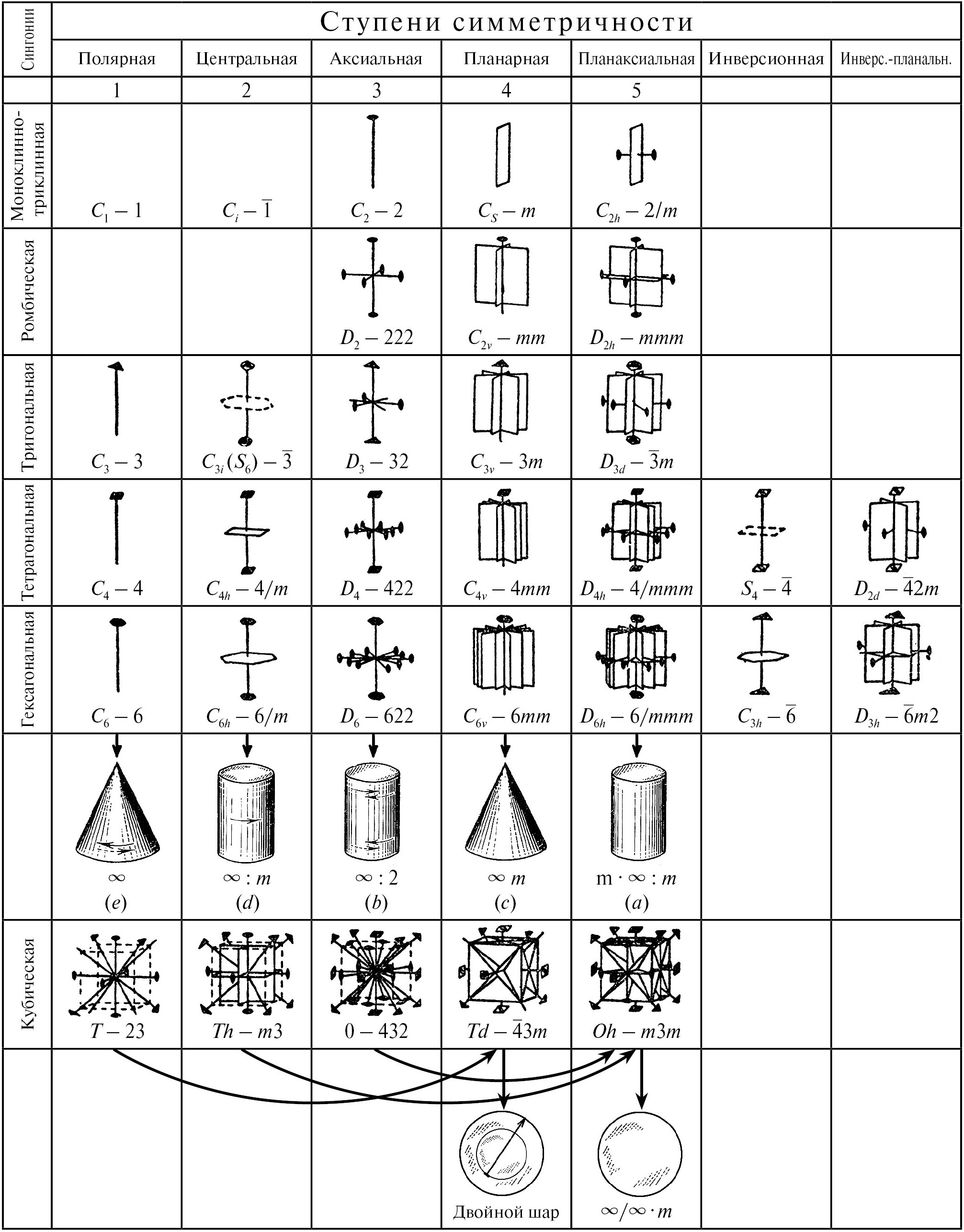 Такая связь вполне конкретна для форм сингоний средней категории, недаром у Кюри подчеркиваются в этом плане осевые предельные группы. Для кубической сингонии и шаровых групп Кюри подобная связь все же достаточно проблематична, и для детализации этой проблемы здесь тоже стоит привести таблицу классов кристаллической симметрии (рис. 3). Расстановка столбцов в ней совпадает с группированием 1, но в обратном порядке: у Кюри (рис. 2) возрастание уровня групп шло справа налево, а в таблице – слева направо. То есть если абстрагироваться от полярности осей, то в каждой строке средней сингонии точечная группа столбца 1 с единственной осью является подгруппой в каждой группе из остальных столбцов справа от нее, так как у любой из них имеется продольная ось. А точечные группы в столбцах 2, 3, 4 независимы друг от друга, и каждая из них поодиночке является подгруппой группы столбца 5, поскольку содержит ту или иную часть элементов симметрии этой группы 5.