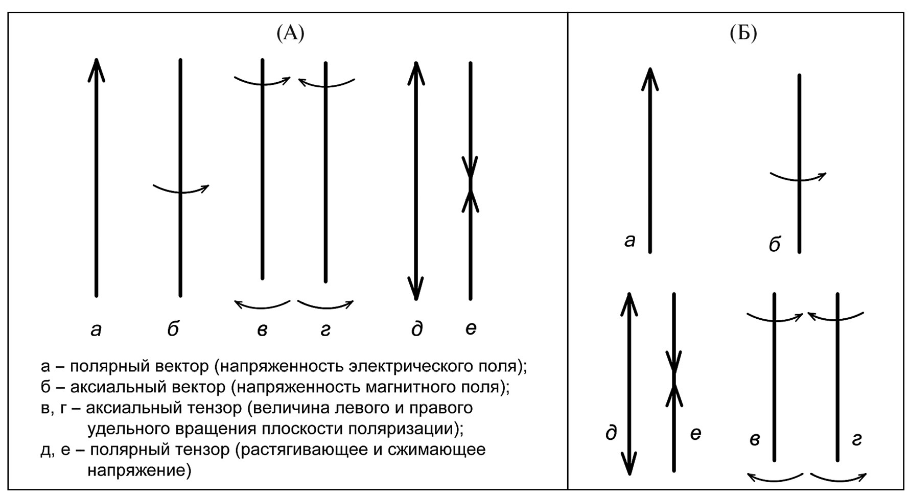 Рис. 4. Четыре типа движений по А.В. Шубникову (векторы и тензоры): А – исходный вариант [10, рис. 2]; Б – фигуры исходного рисунка (а) перегруппированы по системе матрицы: верхний ряд – векторы, нижний – тензоры; левый столбец – полярные сущности, правый – аксиальные.