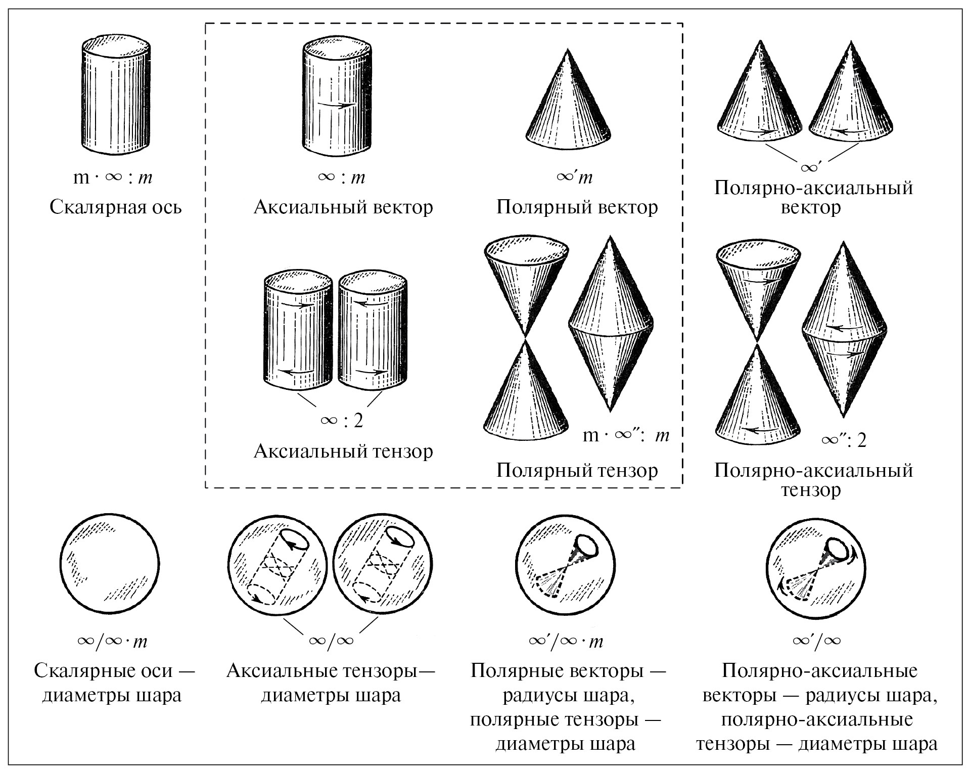 Сходство стандартных элементов симметрии налицо, что может как-то затушевать различие. При этом чистая кинематика говорит, по-видимому, о том же – встречные векторы действительно гасят друг друга, и перемещения предмета в пространстве не происходит. Но здесь существенна не кинематика, а динамика – не перемещается только центр тяжести предмета, а внутреннее движение торцов предмета навстречу друг другу имеет место быть с безусловностью5. Поскольку сжатие налицо, игнорировать эти векторы нельзя. Да и различие в симметриях вполне однозначно: ось цилиндра – скаляр, а у двух соосных конусов она же – тензор, т. е. соосные разнонаправленные векторы. Разница существенная, хотя в шубниковских символах и не отражаемая, так как полярность оси в них не фиксируется в явном виде. Конечно, грамотный кристаллограф и по ним разберется – есть ли в кристалле полярная ось или нет, поскольку строение кристаллов вполне закономерно. Но это возможно только в рамках классической кристаллографии, а при выходе в предельные формы симметрии, как показано выше, уточнение о качестве оси становится необходимым. Поэтому здесь обозначим полярную ось штрихом (2ʹ, 3ʹ, …∞ʹ), а тензорную, т. е. пару соосных векторов, – двумя штрихами. Тогда символ предельной группы для полярного тензора станет (m·∞ʺ:m) в отличие от символа покоящегося цилиндра (m·∞:m).