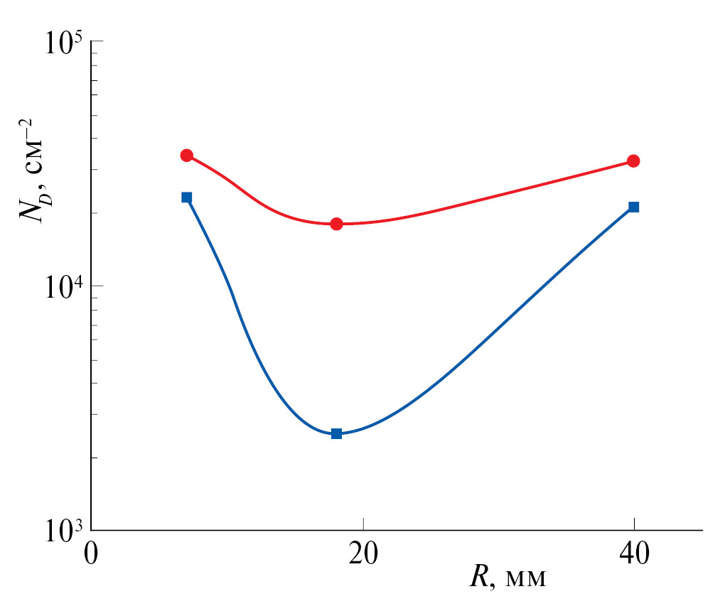 Рис. 2. Распределение дислокаций по радиусу кристалла диаметром 80 мм, выращенного в магнитном поле частотой 300 Гц (–■-), и кристалла, выращенного без магнитного поля (–●-).
