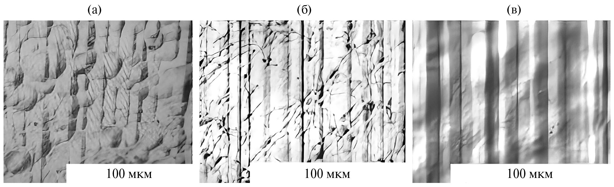 Рис. 4. Микрофотографии “полос роста” в монокристаллах GaAs, выращенных при различных частотах бегущего магнитного поля, вектор индукции которого направлен сверху вниз: а – без магнитного поля, б – в поле 150 Гц, в – в поле 300 Гц.