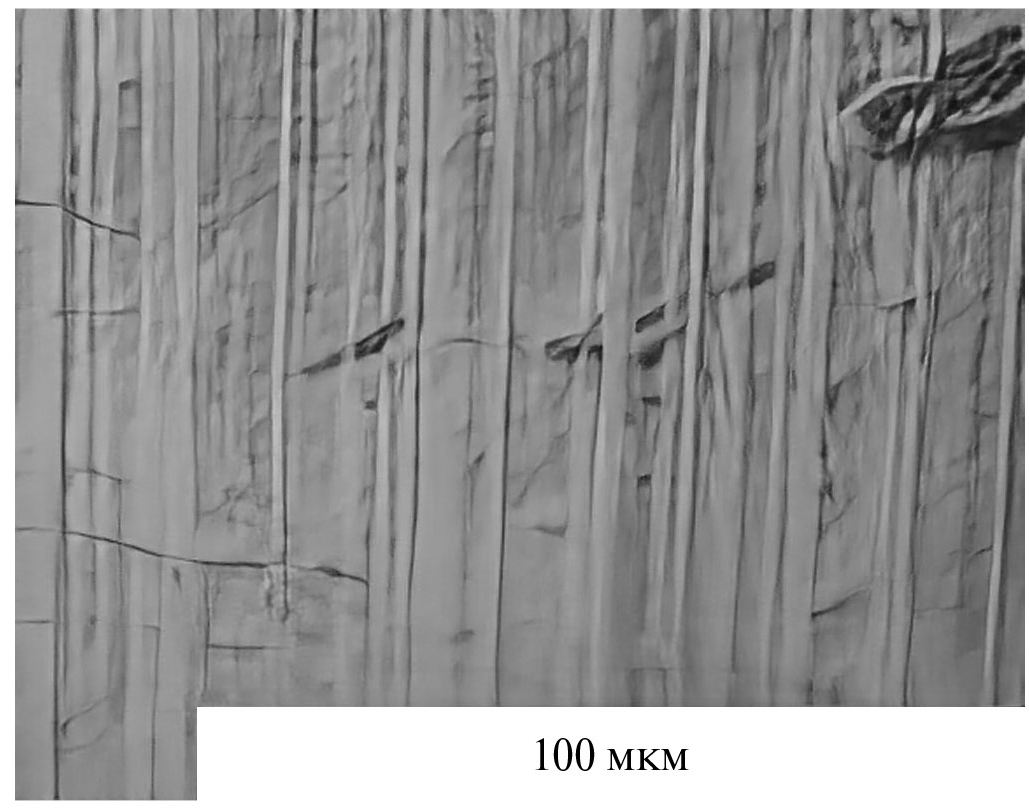 Рис. 5. Микрофотографии “полос роста” в монокристалле GaAs, выращенном в магнитном поле, вектор индукции которого направлен снизу вверх с частотой 300 Гц.