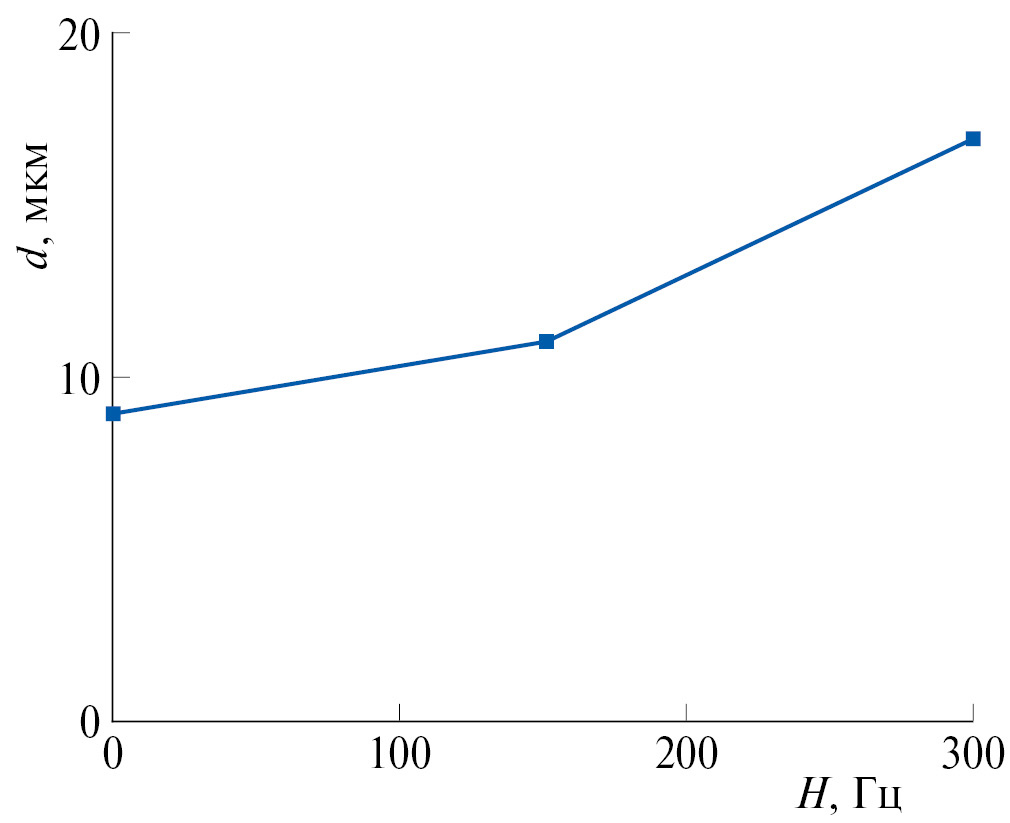 Зависимость расстояния между “полосами роста” d от частоты магнитного поля, направленного сверху вниз, показана на рис. 6. Очевидно, что величина d возрастает с ростом частоты магнитного поля.