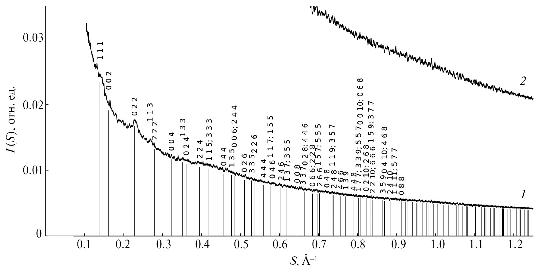Электронные дифракционные картины измеряли с помощью модернизированного электронографа ЭМР-102 при ускоряющем напряжении 100 кВ. Для измерений использовали разработанную авторами систему регистрации, ранее описанную в [20], с существенными доработками. Важная особенность новой системы в том, что измерения основаны на раздельной синхронной регистрации по двум каналам I(t) и X(t) и последующей обработке, позволяющей исключить t и получить зависимость I(X), где t – время, I – интенсивность, X – координата на дифракционной картине. Измерение осуществляют при последовательном отклонении (сканировании) дифракционной картины с помощью отклоняющих катушек перед неподвижным детектором.