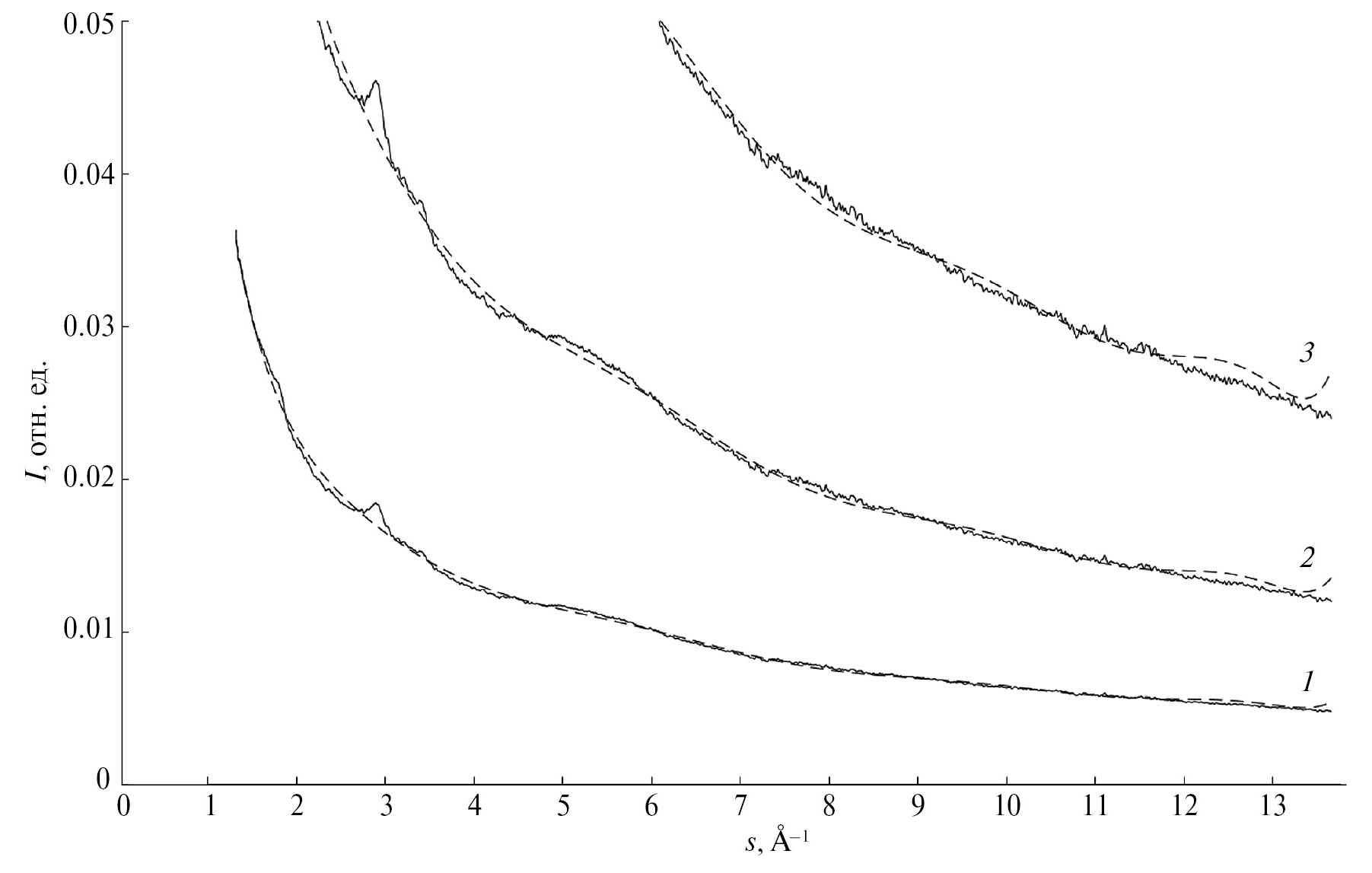 Рис. 5. Зависимость I(s) (сплошная кривая) – результат фильтрации двусторонним фильтром Баттерворта данных, представленных на рис. 4 (кривая B); i0(s) (штриховая кривая) – результат полиномиальной МНК-интерполяции I(s) полиномом десятой степени, где угловой параметр s = 4π(sinθ)/λ. Для наглядности одни и те же графики приведены в разных масштабах: 1:1 (1), 2.5:1 (2), 5:1 (3).