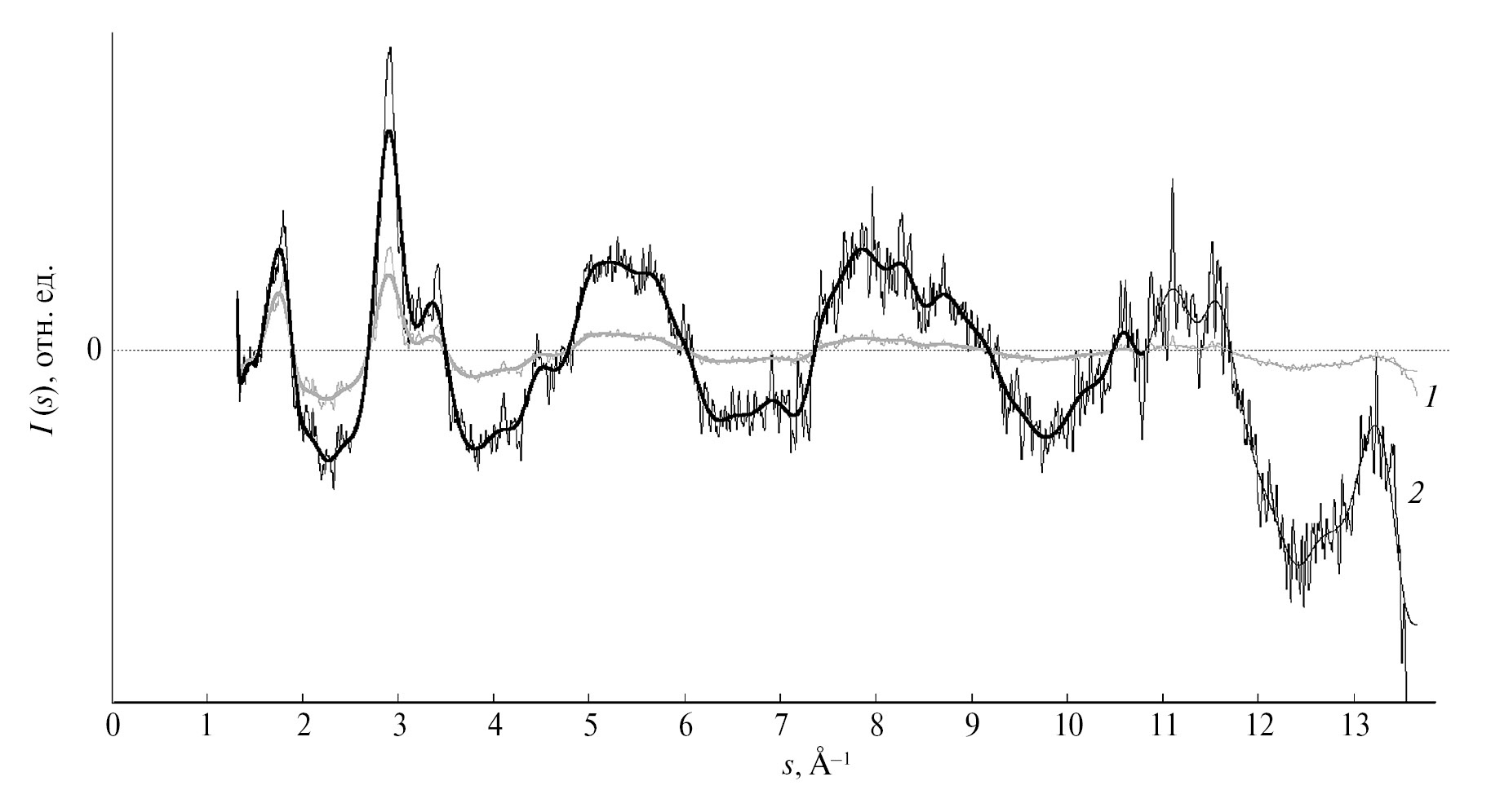 На рис. 6 представлена интерференционная функция i(s) = I(s) – i0(s), полученная вычитанием из исходной функции интерполирующего полинома. Также показан результат фильтрации этой функции двусторонним фильтром Баттерворта (порядок фильтрации – 3, ширина (период) среза частотной фильтрации – 800 семплов шкалы АЦП по координате s). Необходимость повторной фильтрации возникла в связи с увеличением относительного размаха шумов после вычитания полинома i0(s), что привело к существенному уменьшению абсолютного значения сигнала при сохранении абсолютного значения шума и, как следствие, к ухудшению соотношения сигнал/шум. Результат умножения этих функций на угловой параметр s, т. е. i(s)s, представлен в виде кривой 2. Это позволяет оценить корректность полученной интерференционной функции: по физическому смыслу i(s)s → 0 при возрастании s. На рисунке видно, что это верно при s < 10.8 Å–1, а далее начинается область сомнительных и затем некорректных данных, подлежащих исключению из расчетов (показано тонкими линиями).