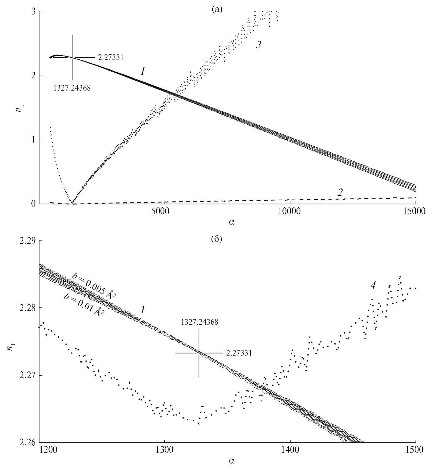 Действительно, поведение семейств графиков функций n1(α), построенных для различных b, существенно отличается от описанного выше [24–26]. Эти графики не имеют компактной области пересечения в окрестности некоторой точки (n1, α), а в некоторых случаях вообще не пересекаются друг с другом. Это можно считать экспериментальным подтверждением существенного отклонения структуры ПТФЭ от собственно аморфной.