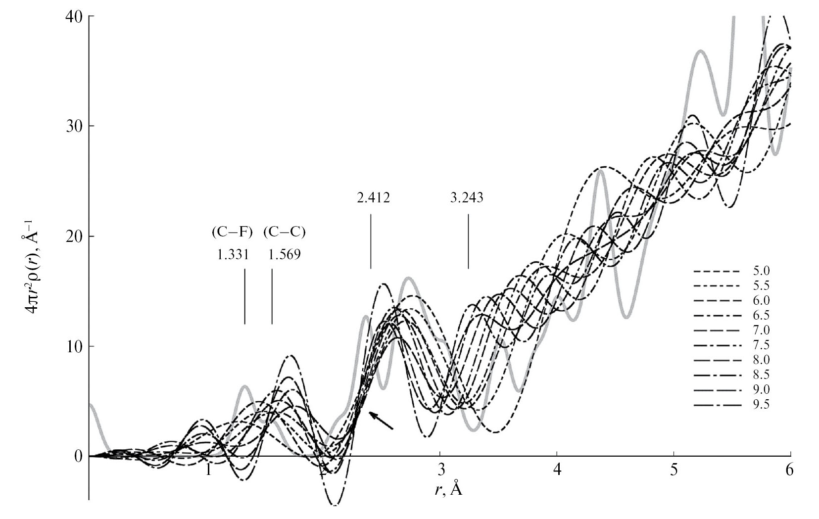 Пример полученных в результате расчетов ФРР представлен на рис. 8, 9. Как оказалось, вид ФРР существенно зависит от верхнего предела интегрирования s2 в уравнении (1). Это касается не только области s2 > 10.2 Å–1, в которой данные не вполне достоверны (как это было рассмотрено выше). Такая ситуация для аморфных структур в целом не характерна. В качестве причин логично предположить выход за условия применимости уравнения (1), выведенного в [27] для классических аморфных структур, не имеющих особенностей, присущих ПТФЭ. Возможно, это следствие особенностей экспериментальных данных, малого соотношения сигнал/шум и необходимости двукратного применения фильтра Баттерворта. Проверить эти предположения нельзя ввиду уникальности структуры и свойств ПТФЭ и отсутствия подходящего для сравнительного экспериментального исследования иного объекта с аналогичными свойствами.