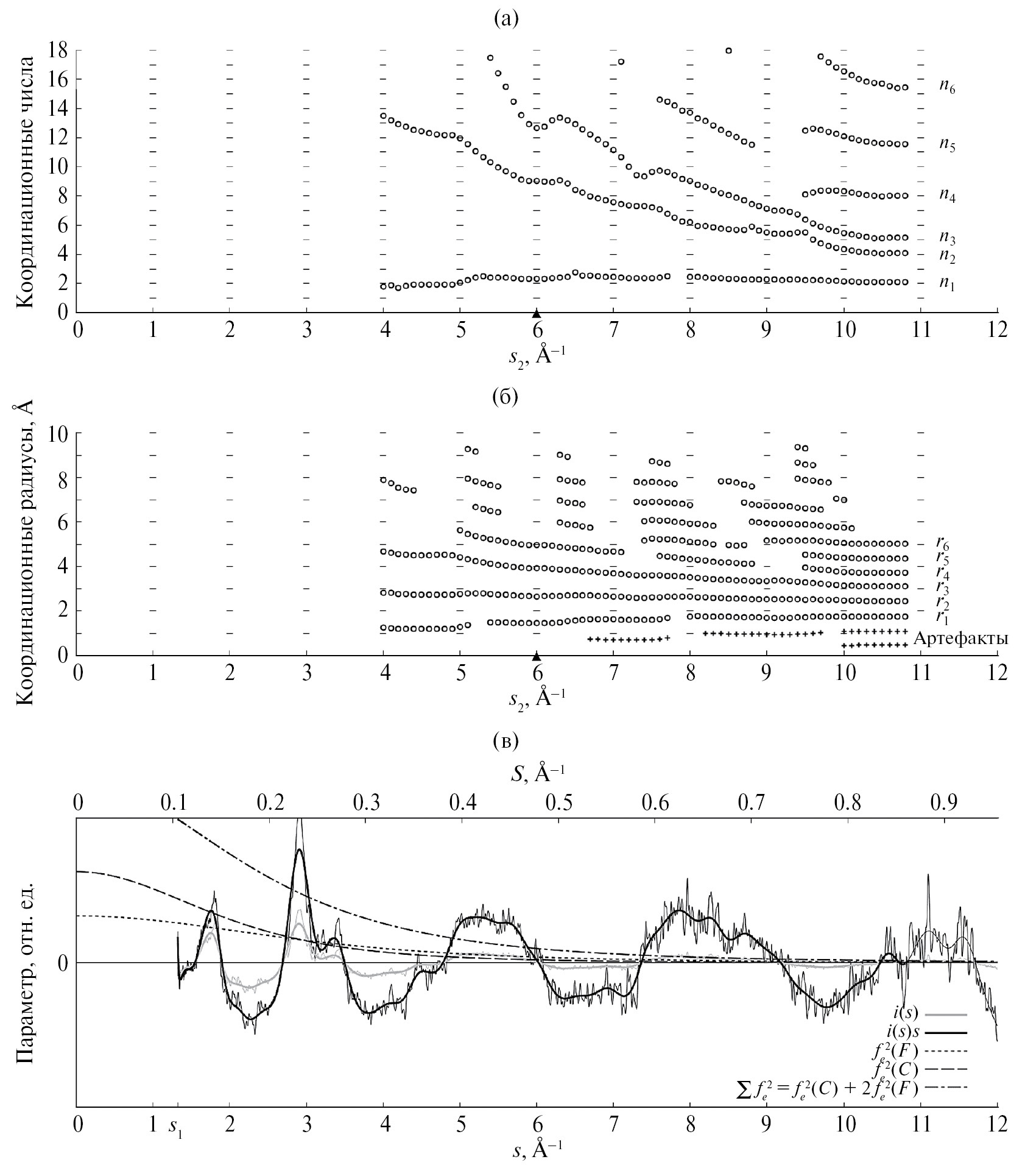 Результаты расчетов при варьировании верхнего предела интегрирования s2 в интервале от 4 до 10.8 Å–1 представлены на рис. 10. Нижняя граница (4 Å–1) выбрана таким образом, чтобы в промежуток интегрирования попадало не менее двух интерференционных максимумов (гало). В противном случае описанная процедура поиска коэффициента нормировки теряет физический смысл (для наглядности и удобства сравнения интерференционная кривая представлена на том же рисунке в том же масштабе по шкале абсцисс (рис. 7б)). Верхняя граница (10.8 Å–1) выбрана исходя из того, что нет уверенности в корректности экспериментальных данных при больших значениях s2 (рис. 10в). Пропущенные значения соответствуют ситуациям, когда пики на графике не выделяются из-за отсутствия четких минимумов слева и справа от них.