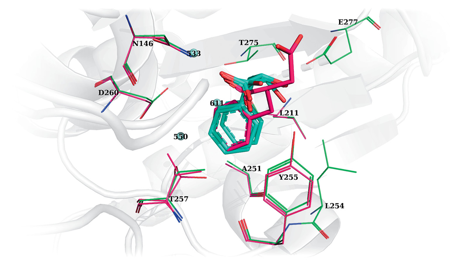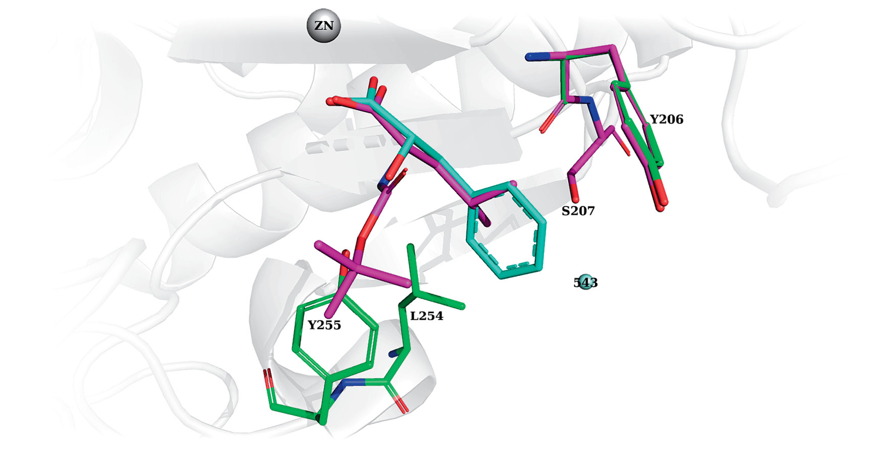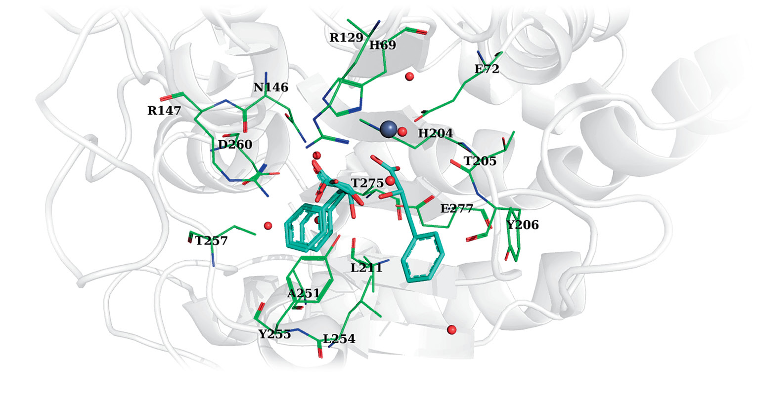 В S1ʹ-субсайте КПТ фенильное кольцо L-фениллактата образует гидрофобные контакты с L211, G215, A251, L254, Y255, полярные контакты с N146, S252 и E277, амфифильные контакты с T257, D260, T262 и T275. Фенильное кольцо бензилянтарной кислоты образует эти же контакты с КПТ, за исключением Е277, L254 и T275 (рис. 2).