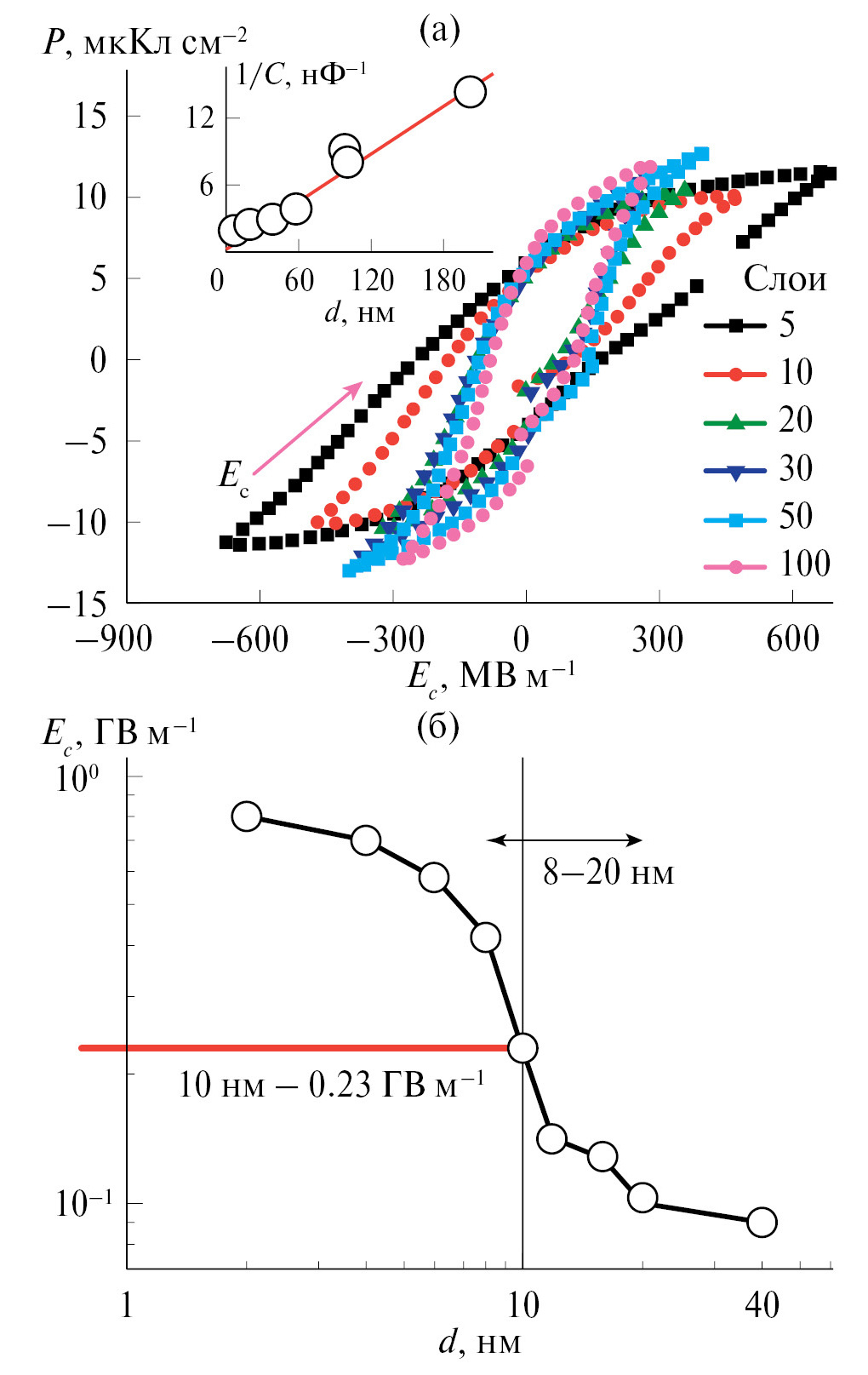 Рис. 4. Петли гистерезиса ЛБ-пленки PVDF [32] с разным числом монослоев: 5, 10, 20, 30, 50 и 100 МС (а); вставка показывает линейную зависимость обратного значения емкости С от толщины пленки d. Ес как функция толщины ЛБ-пленки PVDF (при d = 8–20 нм – переходная область) (б).