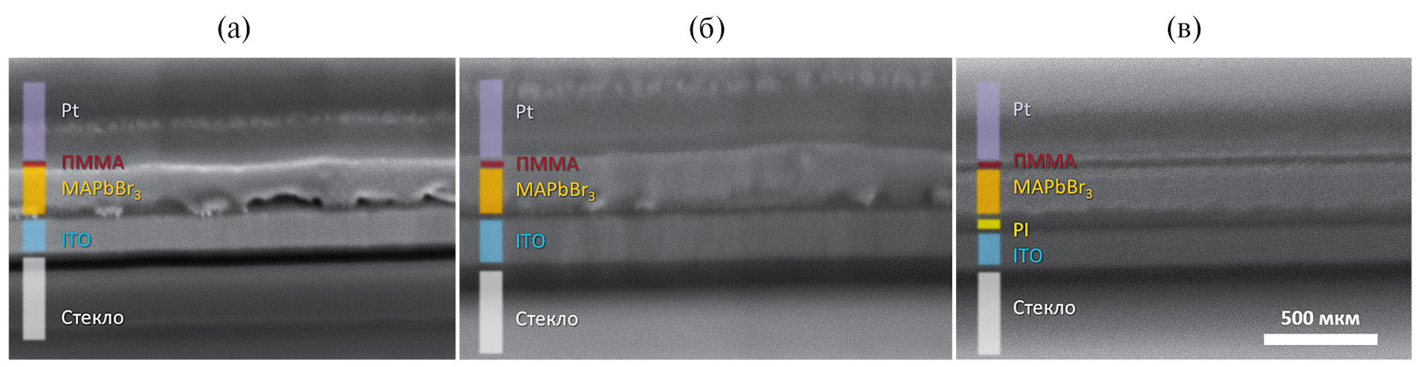 Оптимизация подготовки поверхности подложек. При исследовании качества получившихся пленок MAPbBr3 в РЭМ было выявлено, что при подготовке поверхности методом ультразвуковой очистки с использованием растворителей и поверхностно-активных веществ между слоем ITO и слоем перовскита образуются полости (рис. 3а), что неприемлемо для применения пленок в качестве основы для создания фотонных метаповерхностей. В этой связи были исследованы другие подходы к подготовке поверхности. Эффективность плазменной очистки зависит от характеристик плазмы: обработка плазмой относительно малой мощности не дает сколь-либо заметного изменения, увеличение мощности плазмы приводит к уменьшению количества и размера, но не полному исчезновению полостей (рис. 3б). В третьем варианте обработки на очищенной подложке была сформирована тонкая (~20 нм) пленка полиимида. Этот материал широко используется в ЖК-дисплейной технологии в качестве промежуточного покрытия дисплейных стекол с ITO-электродами для планаризации, улучшения сродства и адгезии последующих слоев [9]. Подход оказался эффективным и для слоя перовскита – его пленка плотно прилегает к слою полиимида, не образуя полостей (рис. 3в).