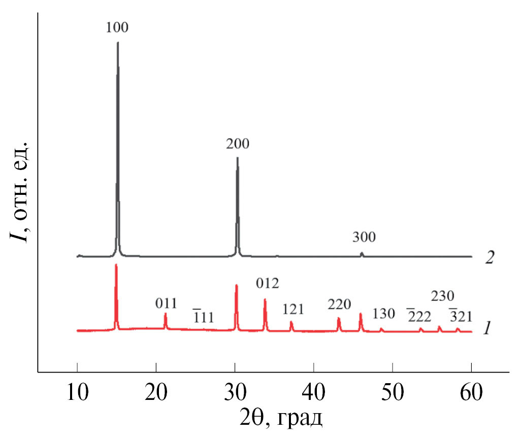 Определение кристаллической структуры пленок. Дифрактограммы полученных пленок отвечают кубическому MAPbBr3 (пр. гр. Pm3m, a = 0.585 нм), они совпадают с данными [10], а наблюдаемые пики соответствуют дифракции на плоскостях (100), (200) и (300). Также было проведено сравнение дифрактограмм пленки с дифрактограммами порошка, полученного перемалыванием дополнительно выращенных отдельных монокристаллов MAPbBr3. Как видно из рис. 4, положения всех пиков на дифрактограмме пленки (кривая 2) близки к положениям аналогичных пиков на дифрактограмме порошка (кривая 1), но незначительно смещены, что связано с отклонением параметра решетки, который для порошка составляет a = 0.593 нм. Помимо трех пиков, характерных для пленки, дифрактограмма порошка демонстрирует дополнительные пики, отвечающие отражениям от плоскостей кубического MAPbBr3. Такое различие дифрактограмм однозначно свидетельствует о преимущественной ориентации кристаллитов в пленке вдоль направления [100] перпендикулярно подложке.