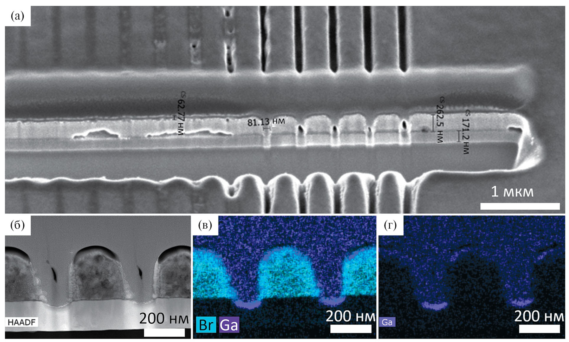 Создание тестовых структур. На первом этапе для выяснения возможности литографии с помощью сфокусированного ионного пучка полученных перовскитных пленок использовали цифровые шаблоны сплошных параллельных полос с постепенно увеличивающимся временем облучения. Для повышения качества обработки был выбран режим относительно слабого тока ионного пучка 50 пА при ускоряющем напряжении 30 кВ и экранном увеличении 5000 крат. По окончании обработки такие тестовые структуры поперечно разрезали пучком и исследовали в РЭМ (рис. 5а). Было обнаружено, что при толщине пленки перовскита ~260 нм можно сформировать сквозные щели шириной ~80 нм. Даже учитывая погрешности измерения в РЭМ в таком диапазоне размеров, можно сделать вывод о необычайно высоком соотношении размеров сечения щелей. По картам распределения элементов в срезах тестовых структур, полученных в ПРЭМ методом энергодисперсионной рентгеновской спектроскопии, было установлено, что загрязнение образца атомами галлия при обработке пучком происходит преимущественно на поверхности ITO на дне щелей. На стенках щелей значительного количества галлия не обнаружено (рис. 5б–5г).