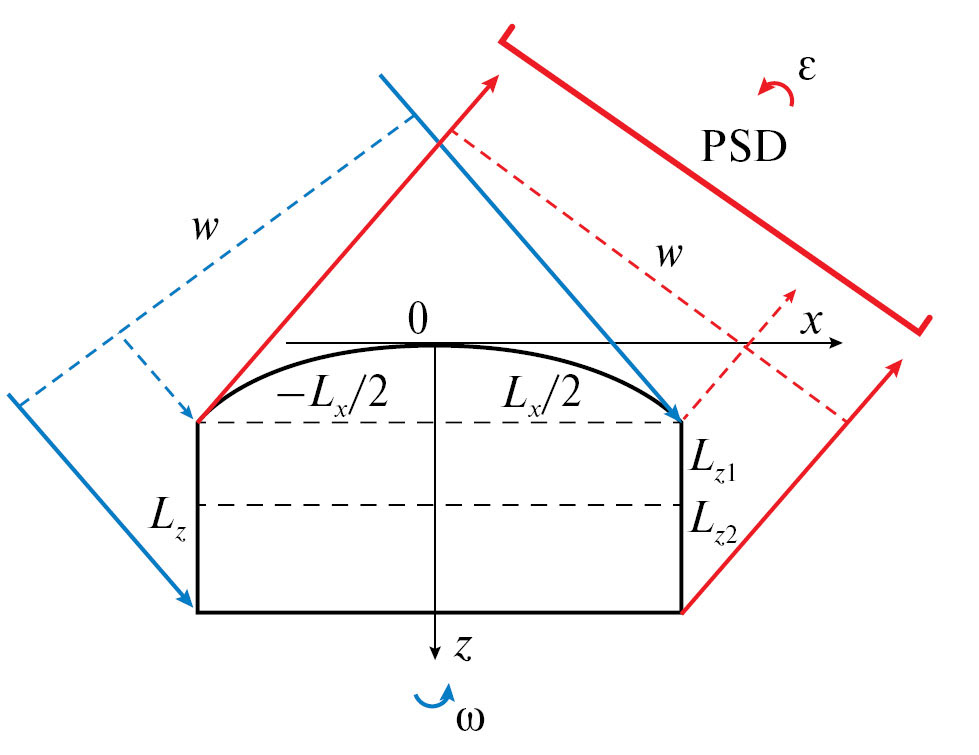 Рис. 1. Схематическое изображение рентгеновской дифракции от чипа МЭМС, состоящего из верхней изогнутой части толщиной Lz1 и нижней совершенной или градиентной области кристалла толщиной Lz2. Ширина падающего и отраженного рентгеновского пучка w, засветка поверхности структуры имеет размер Lx. PSD – позиционно чувствительный детектор.