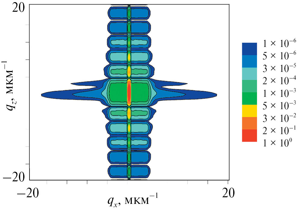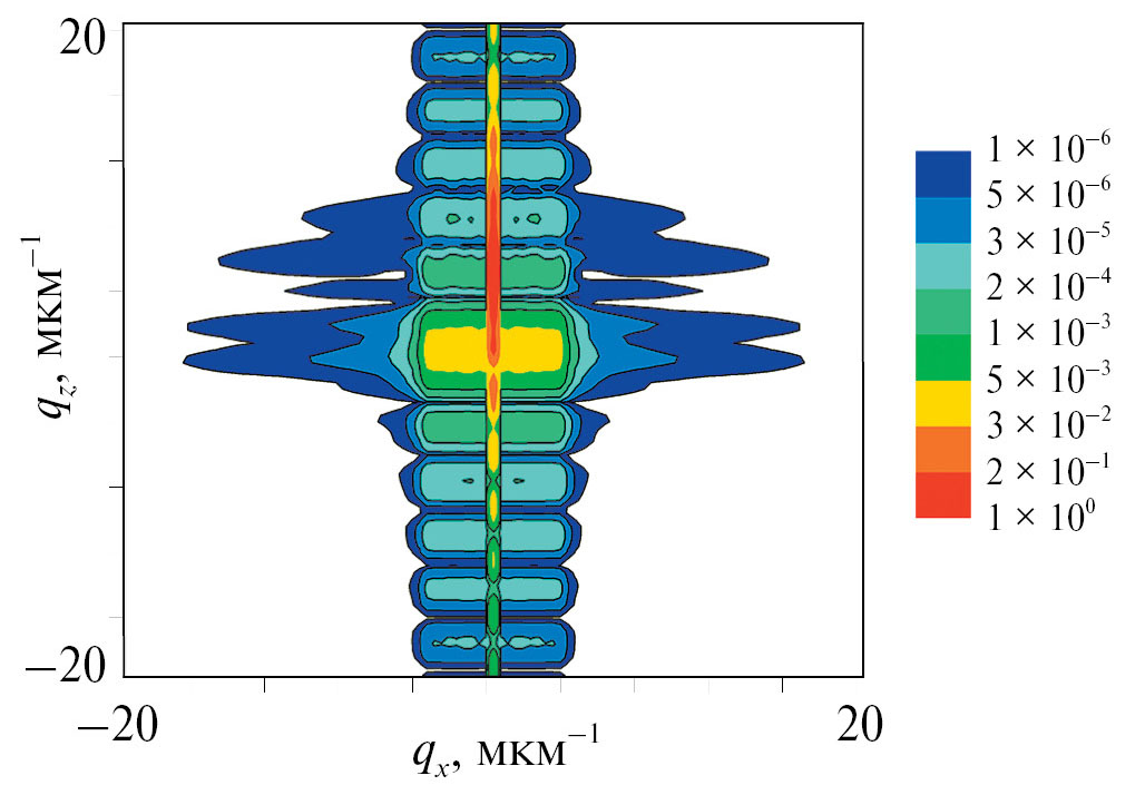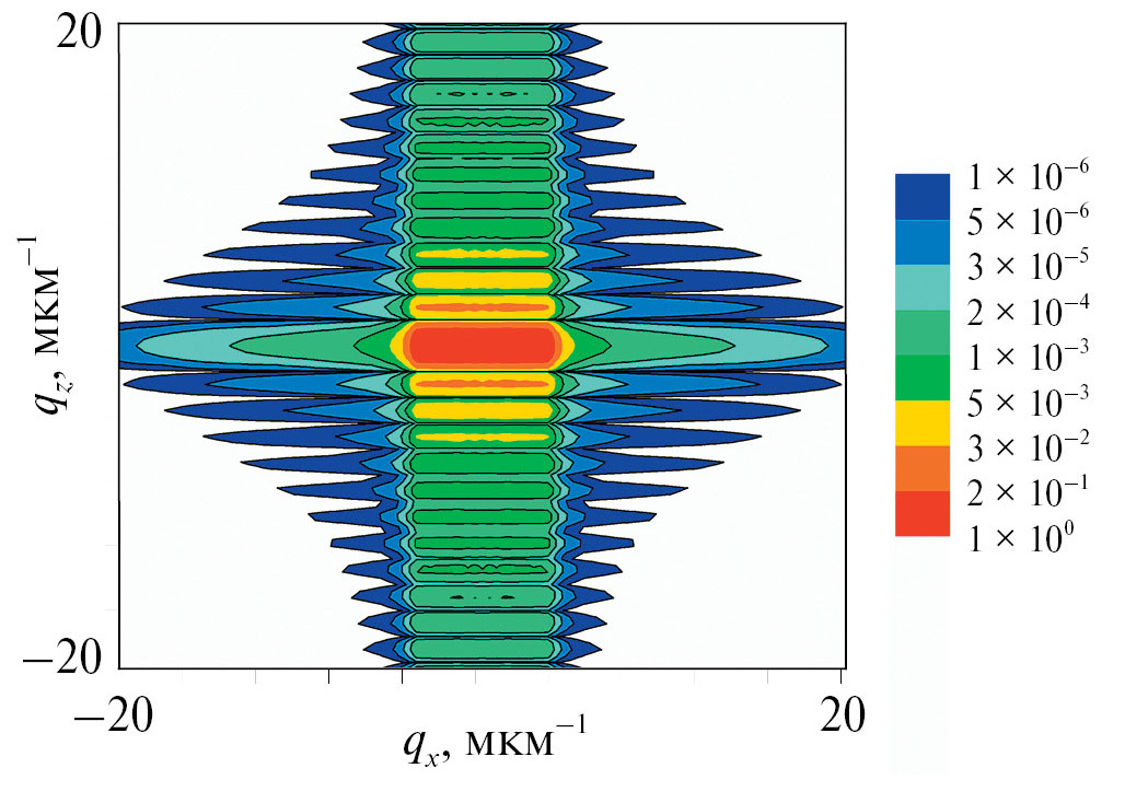 Обычно карты RSM рассчитываются с использованием двумерных рекуррентных соотношений или уравнений Такаги–Топена [4]. Такие вычисления требуют больших затрат компьютерного времени даже в случае тонких кристаллов. Предложенный метод расчетов карт RSM сокращает вычислительное время на три–четыре порядка. Например, вычисление карты RSM с помощью нового метода в кинематическом приближении (рис. 2) выполняется за 10–15 с. Аналогичный по точности расчет на основе уравнений Такаги–Топена с применением алгоритма “полушаговой производной” (300 шагов вдоль вертикального направления вычислительной сетки, 5000 шагов вдоль латерального направления и 100 × 100 разбиений по угловым координатам (qx, qz)) требует порядка 3–4 ч.